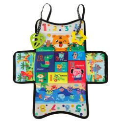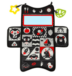 Rinkinyje yra 8 spalvotos servetėlės ir 3 storesnės medžiaginės servetėlės su unikaliais raštais. Išskleidęs kilimėlį kūdikis taip pat atras veidrodėlį ir du guminius kramtukus. Kiekvienas iš šių elementų stimuliuoja regėjimą ir lytėjimą. Be to, kai kuriuose audiniuose yra švelniai šiugždanti plėvelė, kuri stimuliuoja kūdikio klausos pojūtį, žadina natūralų smalsumą ir norą tyrinėti.