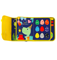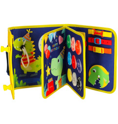 Sensorinė manipuliacinė lenta su dinozaurų motyvais turi elementų, kurie naudingi mokantis kalbos, formų, spalvų ir skaičių. Kai kurie lentoje esantys elementai užrašyti anglų kalba, todėl vaikas gali mokytis ir įtvirtinti žodyną.