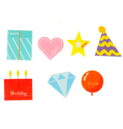 Lipdukai: širdis, balionai, žvaigždė, tortas, dovana, kūginė gimtadienio kepurė, dinozauras