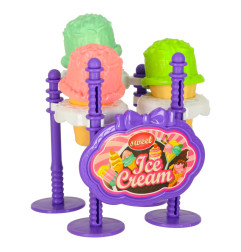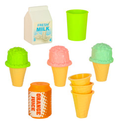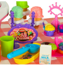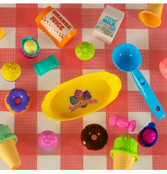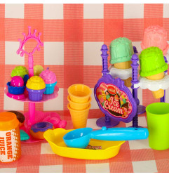 Rinkinį sudaro daugybė žaisliniųelementų: ledai,desertai, taip pat puodelis,padėklas, ledų stovas, ledų šaukštas ir kiti priedai, kurie pripildys bet kokį žaidimą vaizduote ir skoniu. Išvaizdai užbaigti yra spalvingastaltiesė, ant kurios galima įrengti minicukrainę.