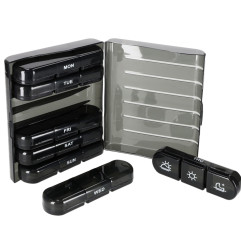 Inovatyvus vaistų konteinerissu užrakinamais skyriais padeda kasdien planuoti vaistus irmaisto papildus. Įrengti 7 mini konteineriai, pažymėti savaitės dienomis ir dienos laiku (ryte, vidurdienį, vakare), leidžiareguliariai vartoti vaistus be pavojaus susipainioti.