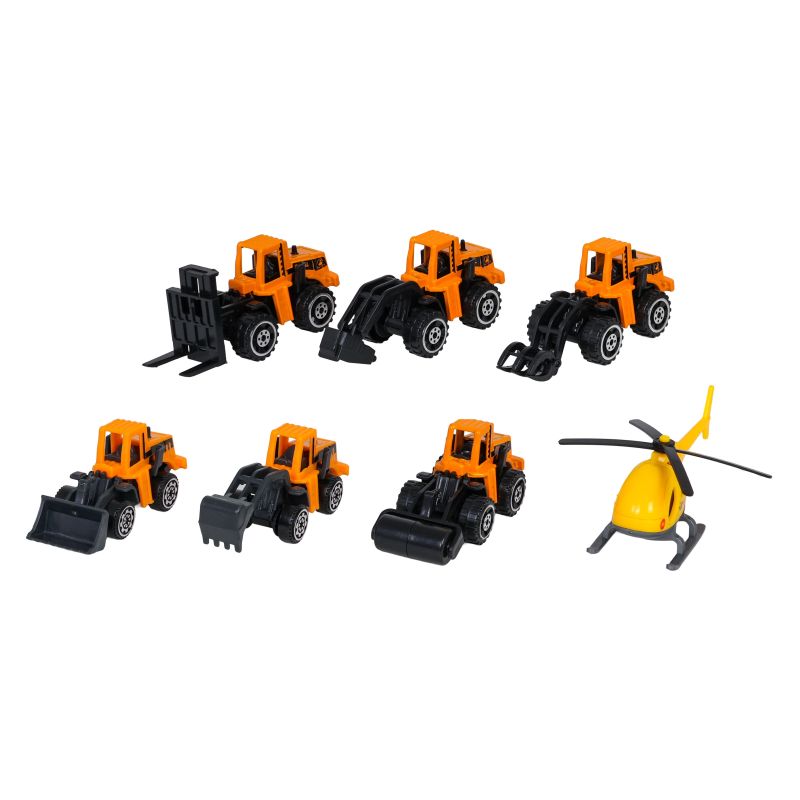 6 statybų transporto priemonės: šakinis krautuvas, transporto priemonė su pneumatiniu kūju, krautuvas, volas, vilkikas, ekskavatorius bei sraigtasparnis.