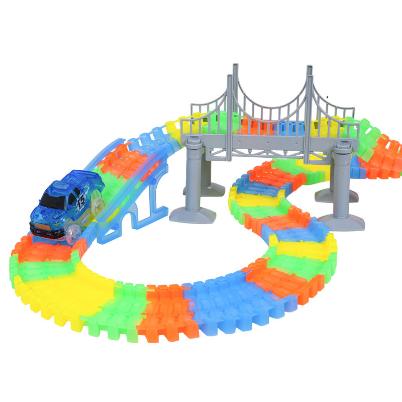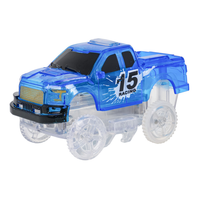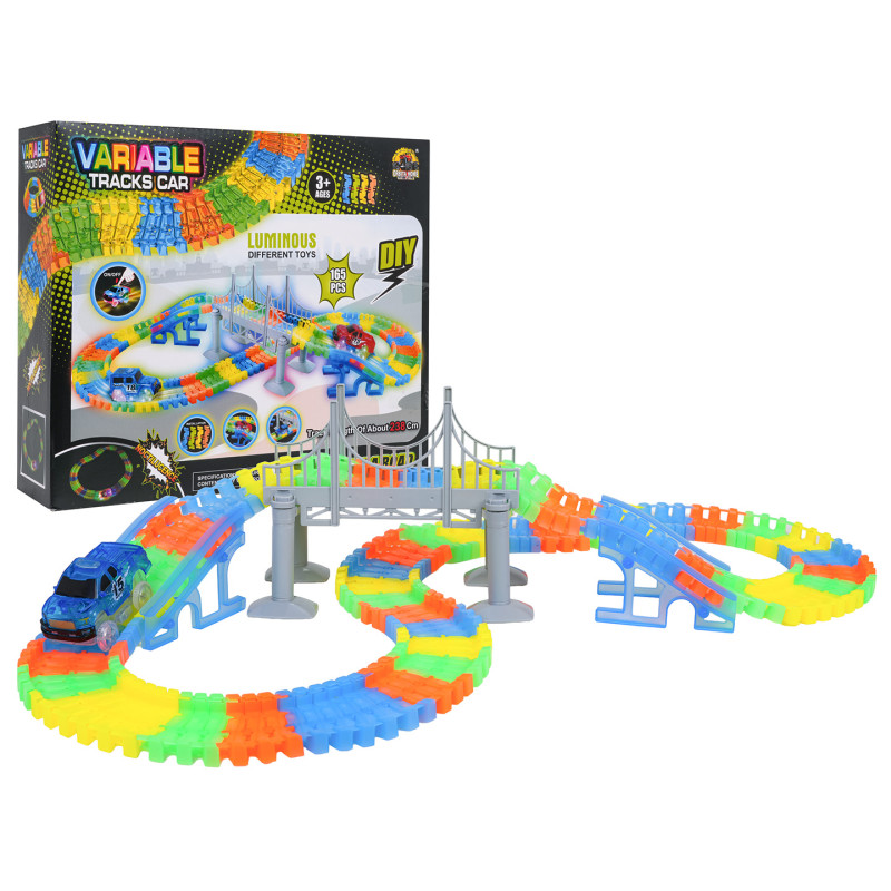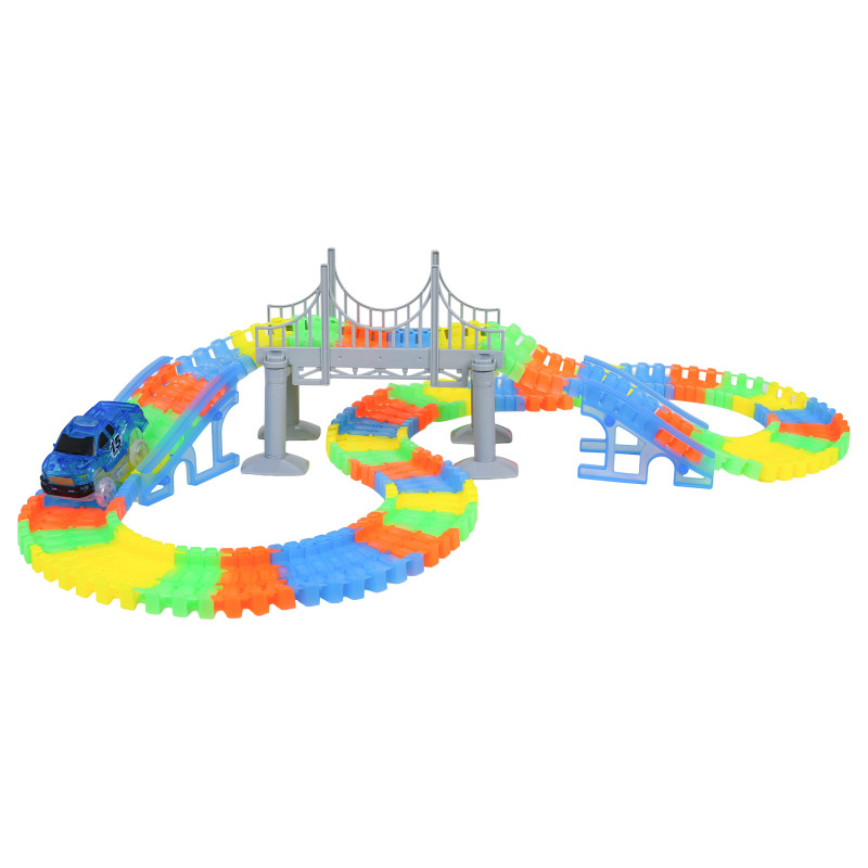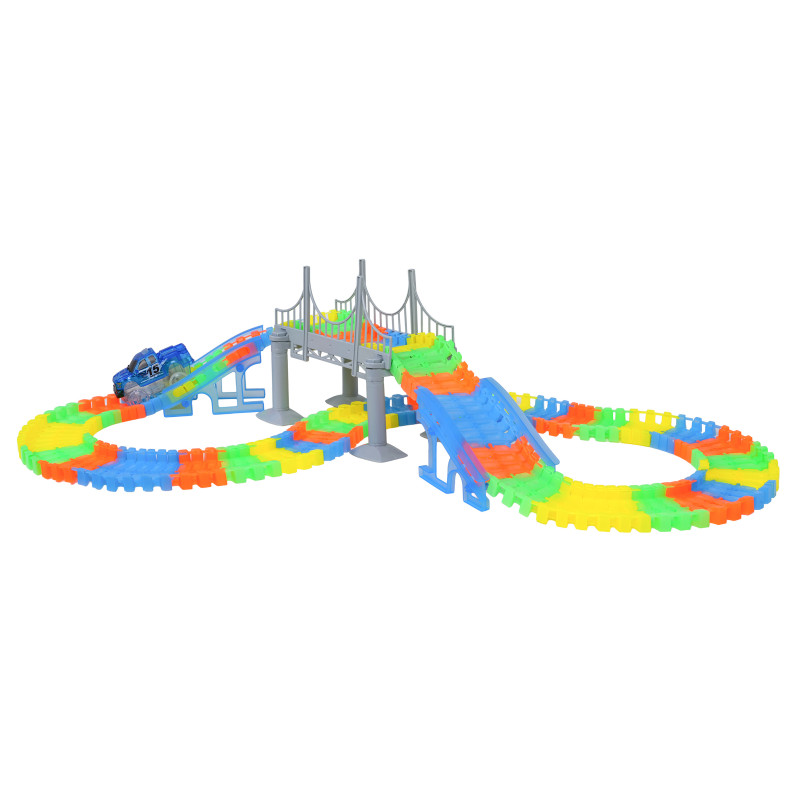 Ši tamsoje šviečianti lenktynių trasa su įmontuotu automobiliu puikiai tinka vaikams nuo trejų metų. Trasos yra lanksčios, todėl jas galima bet kaip sudėlioti, pasukti, pakelti ir perstatyti automobiliui važiuojant. Be to, bėgiai yra fluorescenciniai, šviečiantys tamsoje. Pridedamoje transporto priemonėje yra LED apšvietimas, sukuriantis nuostabų efektą važiuojant tamsoje. Transporto priemonė maitinama 2 x AA 1,5 V baterijomis (į komplektą neįeina). Norėdami užvesti automobilį, tiesiog paspauskite ant stogo esantį mygtuką.
