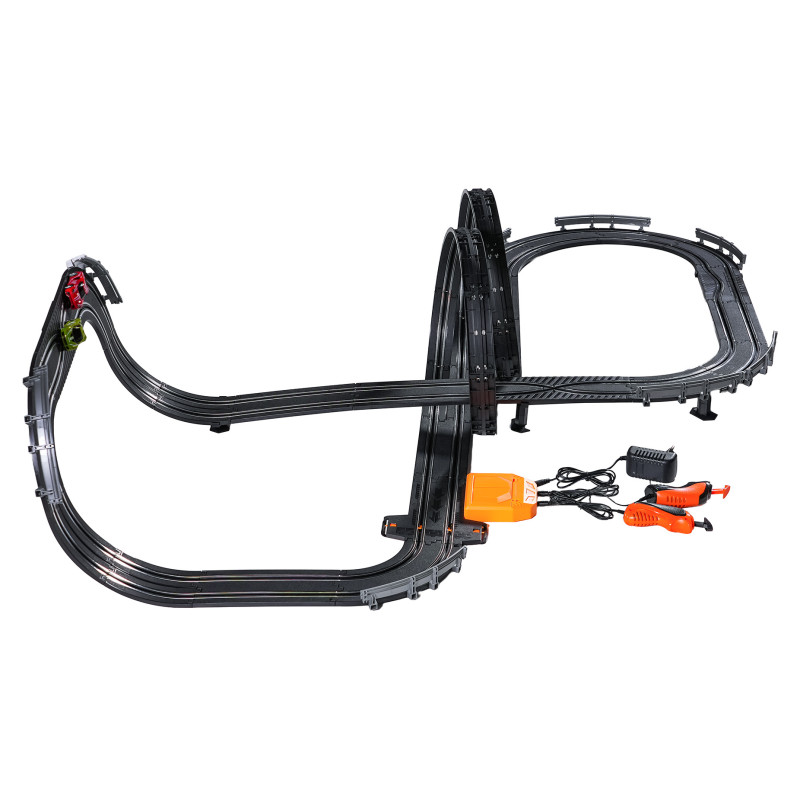 Didelė lenktynių trasa su dviem nuotoliniu būdu valdomais automobiliais ir keičiamais kėbulais, tinkama vaikams nuo šešerių metų. Šis rinkinys leidžia sukurti trasą su dviem kilpomis, staigiais posūkiais ir tiesiomis atkarpomis. Komplekte yra du automobiliai, keičiami kėbulai ir du nuotolinio valdymo pulteliai. Trasa maitinama maitinimo šaltiniu arba baterijomis. Pridedamas 9 V maitinimo šaltinis ir 6 x AA 1,5 V baterijos (į komplektą neįeina).