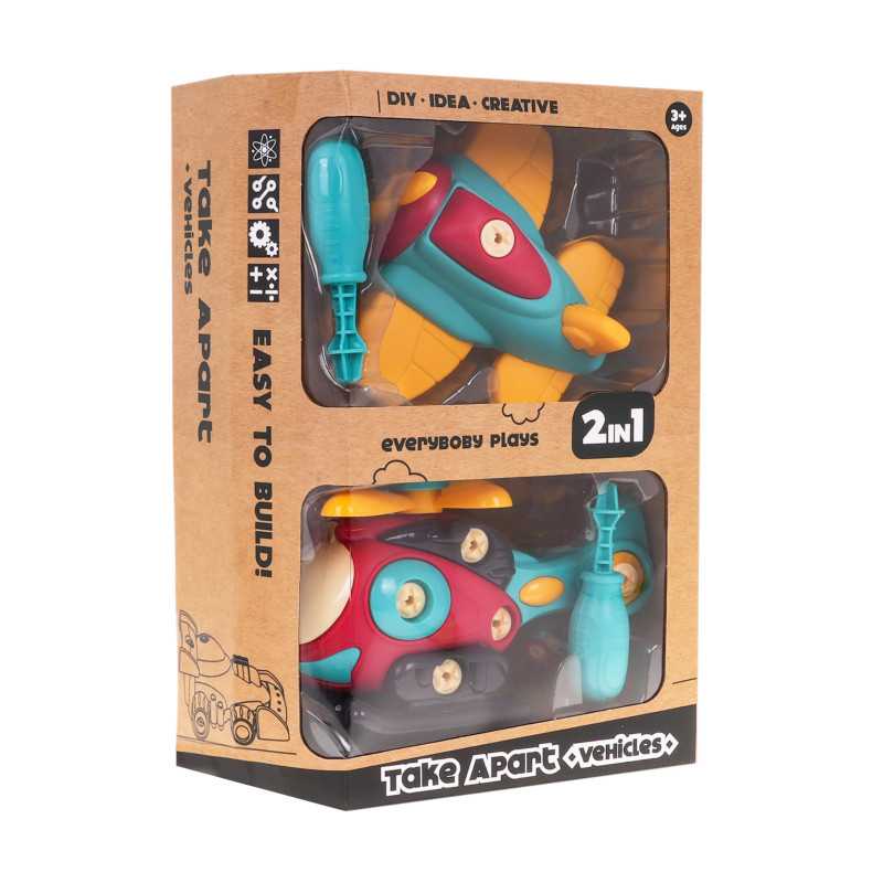 Edukacinis rinkinys "2-in-1", skirtas savarankiškai surinkti lėktuvą ir sraigtasparnį, skirtas vaikams nuo 3 metų. Rinkinyje yra lėktuvas ir sraigtasparnis, kuriuos vaikas gali išardyti su rinkinyje esančiais atsuktuvais ir vėl surinkti. Žaisdamas su rinkiniu vaikas lavina rankų darbo įgūdžius. Sraigtasparnis turi judančių elementų- judančius sraigtus ir atsidarančias piloto kabinos duris. |
