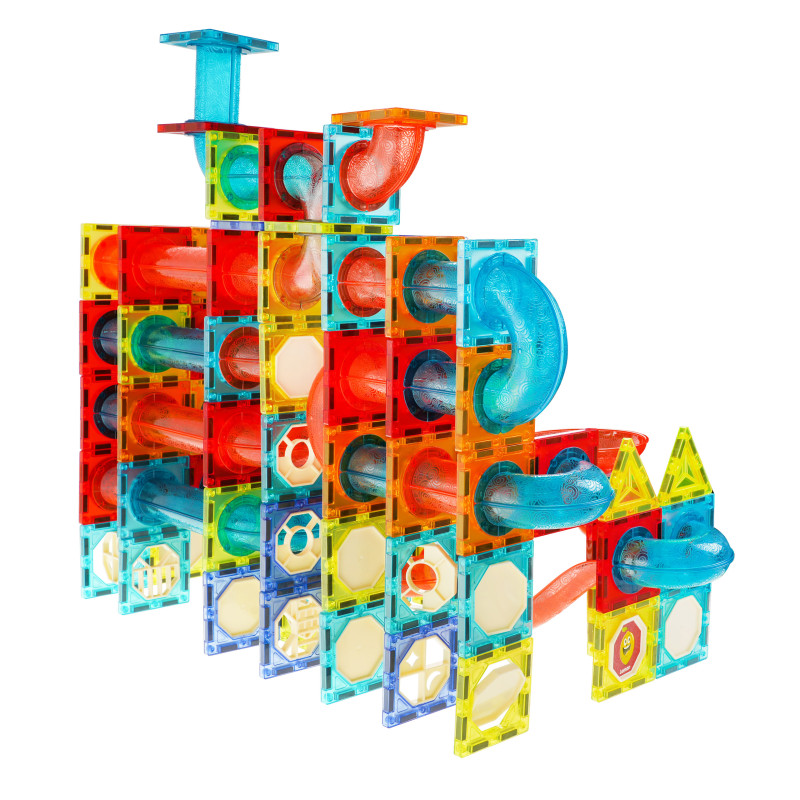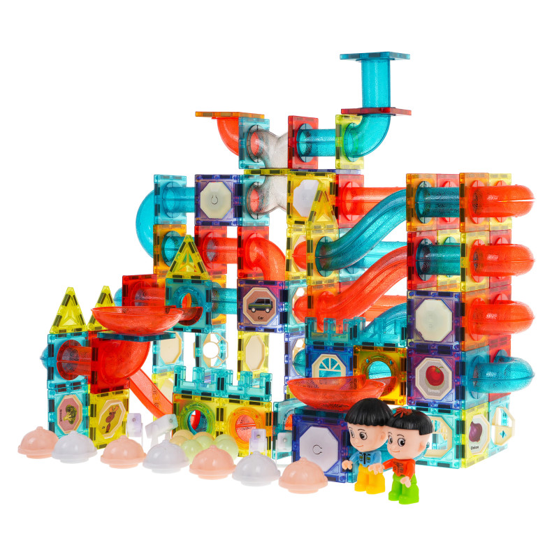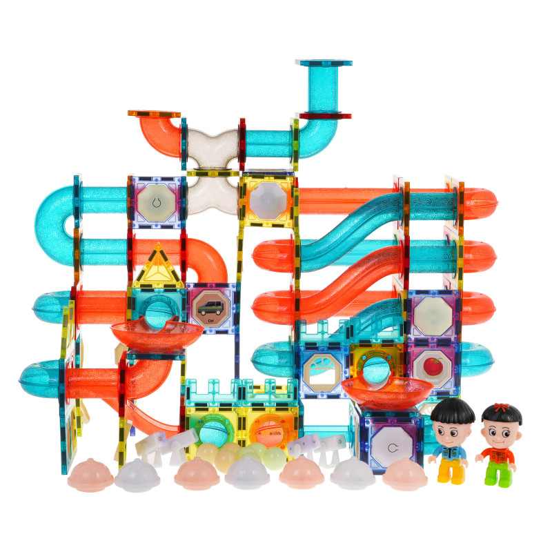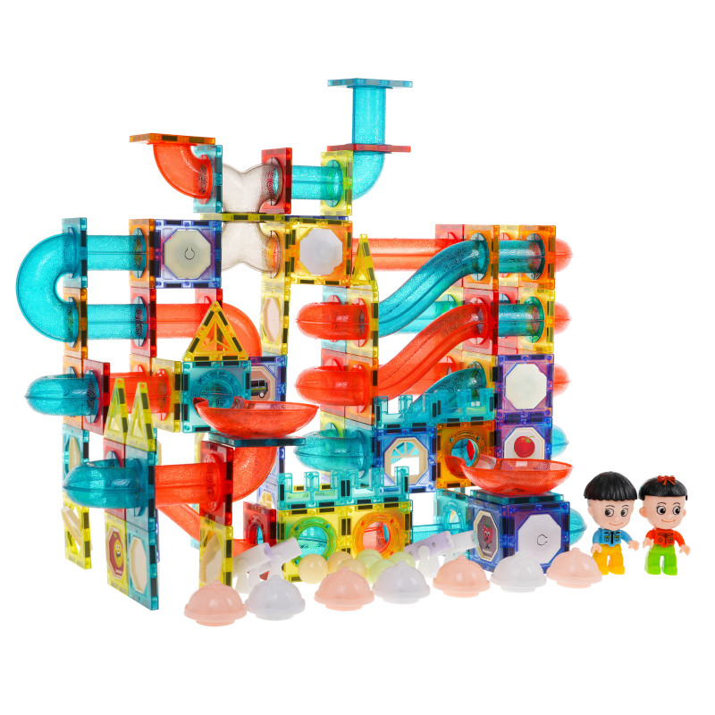 Spalvingų magnetinių kaladėlių rinkinys vaikams nuo 3 metų. Rinkinį sudaro 292 elementai, iš kurių galima pastatyti bet kokio išsidėstymo kamuoliukų takelį. Kai kurie rinkinio elementai maitinami baterijomis, o jas įjungus takelis apšviečiamas pulsuojančiomis švieselėmis, ir pramoga tampa dar įdomesnė. Šviesos mirksi 3 režimais: greitai, vidutiniškai greitai ir lėtai, galite pasirinkti, kuris režimas bus tinkamas jūsų vaikui. Be to, kratant kelis kamuoliukus, jie mirksi švieselėmis. Rinkinyje taip pat yra kelios spalvotos kapsulės, kurios šviečia ir keičia spalvas, ir keli LED atšvaitai. Iš viso rinkinį maitina 36 x 1, 5 V LR1130, 12 x 1, 5 V LR41, 8 x 3 V CR1220 baterijos. Visos baterijos yra komplekte. Blokeliai pagaminti iš geriausios kokybės medžiagos, jie yra lygūs ir kruopščiai pagaminti. Juos sujungiame naudodami įmontuotus magnetus. Magnetai labai gerai laikosi, užtikrindami konstrukcijos stabilumą. Rinkinyje yra vaizdinė instrukcija, kaip surinkti pavyzdinius takelius. |