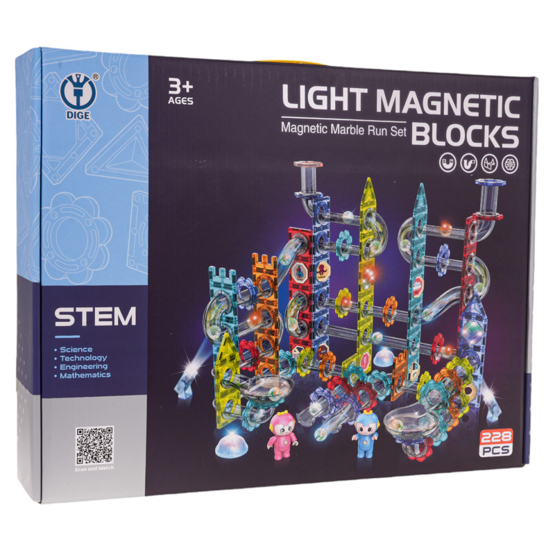Spalvingų magnetinių kaladėlių rinkinys, skirtas vaikams nuo 3 metų amžiaus. Rinkinį sudaro 228 elementai, leidžiantys pastatyti bet kokio išdėstymo kamuoliukų trasą. Kai kurie rinkinio elementai yra maitinami baterijomis, ir juos įjungus, trasa apšviečiama pulsuojančiomis šviesomis, o žaidimas tampa dar įdomesnis. Šviesos pulsuoja 3 režimais: greitu, vidutiniu ir lėtu – galite pasirinkti, kuris režimas tinka jūsų vaikui. Be to, keli kamuoliukai, pakračius, pradeda mirksėti šviesomis. Rinkinyje taip pat yra keletas spalvotų kapsulių, kurios šviečia ir keičia spalvas, ir keli LED atšvaitai. Iš viso rinkinys maitinamas baterijomis, tokiomis kaip 12 x LR1130 1,5 V, 6 x LR41 1,5 V, 8 x CR1220 3 V. Visos baterijos yra pridedamos. Kaladėlės pagamintos iš aukščiausios kokybės plastiko, yra lygios ir kruopščiai apdirbtos. Jos sujungiamos naudojant įmontuotus magnetus. Magnetai labai gerai laikosi, užtikrindami konstrukcijos stabilumą. Rinkinyje yra vaizdinės instrukcijos, kaip surinkti pavyzdines trasas.