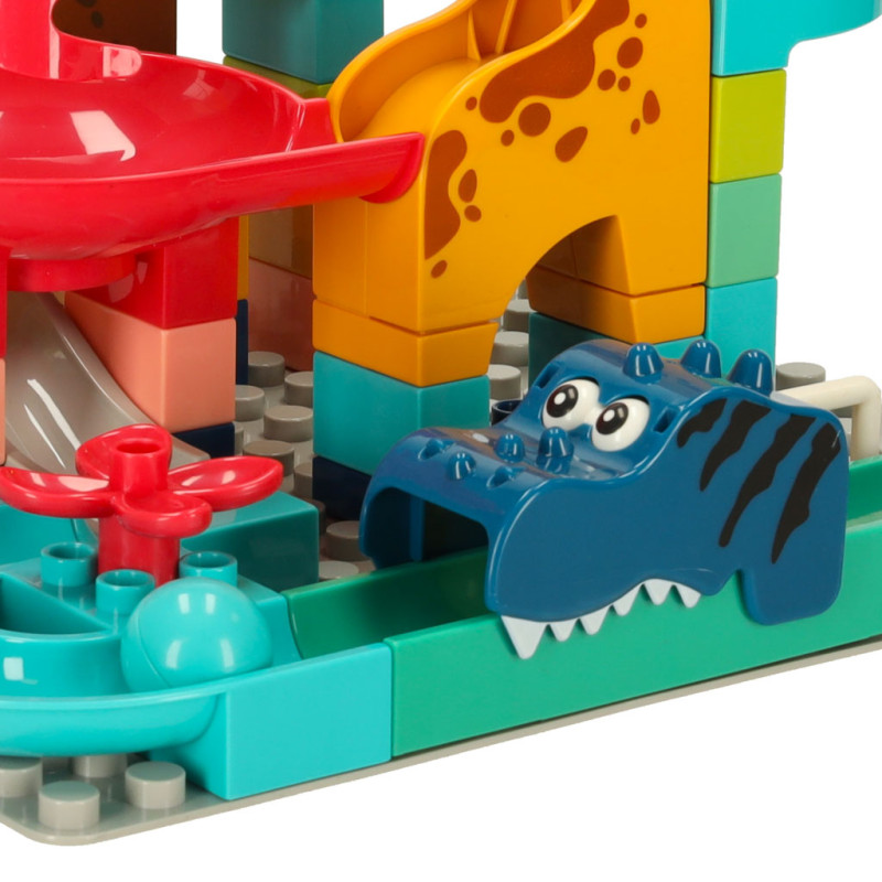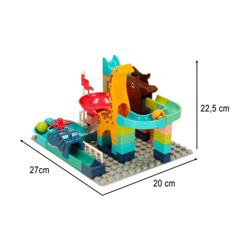 Rinkinį sudaro 58 kaladėlės, iš kurių jūsų vaikas gali sukonstruoti savo kamuoliukų trasą! Detales galima laisvai derinti ir kurti savo vaizduotės kamuoliukų trasas arba pasisemti įkvėpimo iš dėžutės ir pastatyti tokią trasą, kokia pavaizduota nuotraukoje. Rinkinyje yra trys skirtingų spalvų kamuoliukai, kurie riedės sukurtais takeliais.