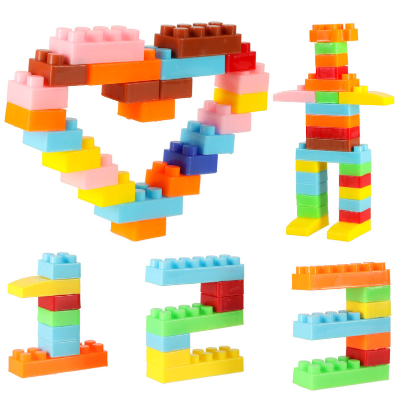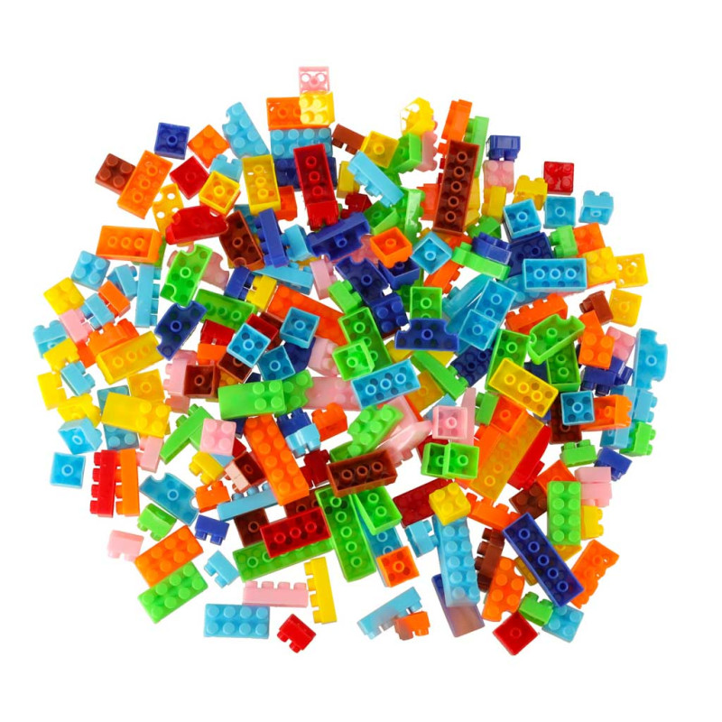 Spalvingų, įvairių formų plastikinių plytų rinkinys.