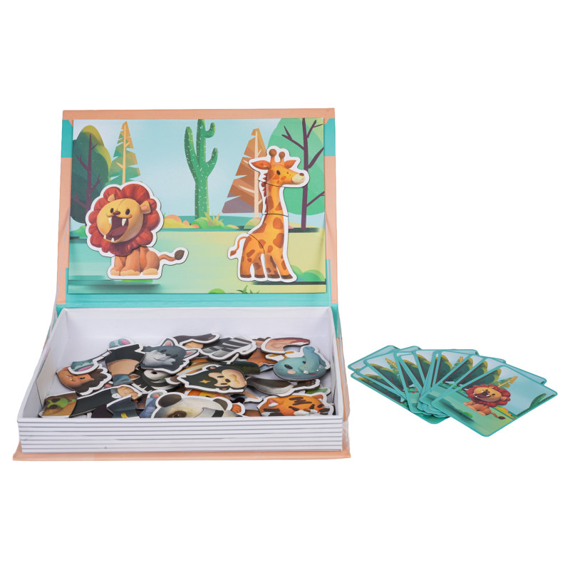 Magnetinė knyga ir edukacinis galvosūkis, skirtas vaikams nuo 3 metų amžiaus. Ši knyga yra ideali dovana. Žaisdami vaikai pažins safari gyvūnus ir lavins savo įgūdžius. Atidarę knygą, vaikai gali prie viršutinės dalies tvirtinti magnetines gyvūnų dėliones, kiekvieną kartą sukurdami savo unikalią istoriją. Rinkinį sudaro 49 magnetinės dalys ir 16 kortelių.