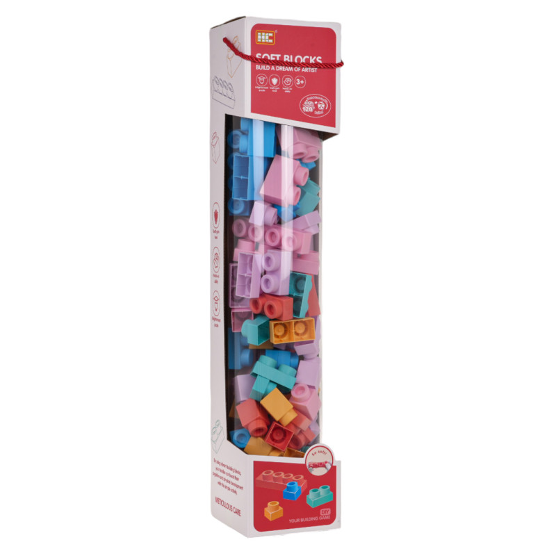 Spalvingų minkštų kaladėlių rinkinys vaikams nuo 3 metų. Rinkinys pagamintas iš PVC medžiagos, kuri yra saugi vaikams ir aplinkai. Blokeliai yra lengvi ir neturi aštrių galų. Juos labai lengva palaikyti švarius, išvirę jie nepraranda spalvos. Blokelius galima lenkti savo nuožiūra, o sulenkti jie grįžta į ankstesnę formą.