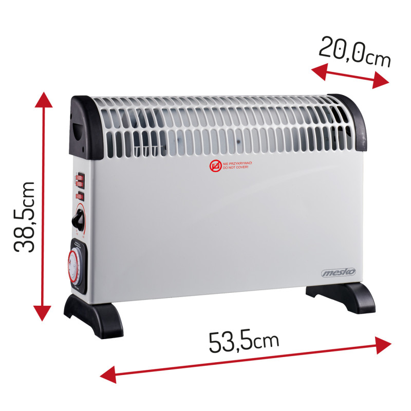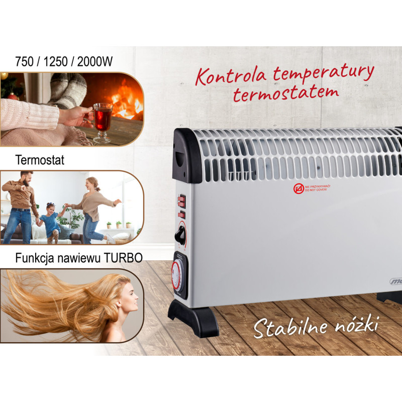 Elektrinis konvektorinis šildytuvas su laikmačiu yra nešiojama įprasto radiatoriaus alternatyva, tik jį galima pastatyti tiksliai ten, kur norite. Iš šildytuvo kylantis šiltas oras veiksmingai pakelia aplinkos temperatūrą, o tai naudinga įvairiose situacijose: ir tada, kai patalpoje nėra kito šilumos šaltinio, ir tada, kai šilumos šaltinių nepakanka joje esančiam žmogui. Konvektorinis šildytuvas tinka tiek namuose, tiek biure. Papildoma TURBO ventiliatoriaus funkcija užtikrina greitą oro paskirstymą. Šildytuve įrengti 3 galios lygiai: 750 W, 1250 W, 2000 W.