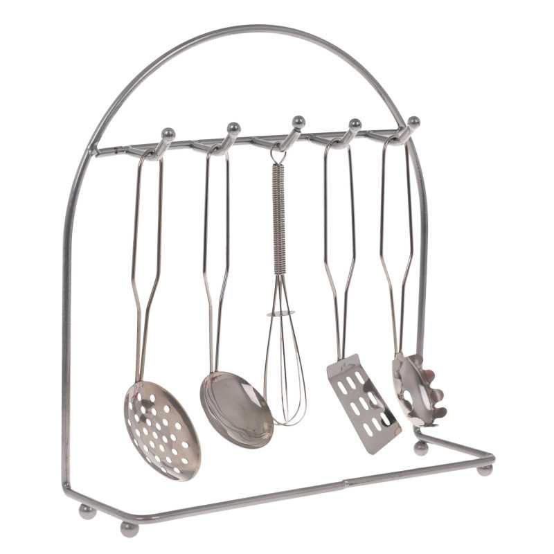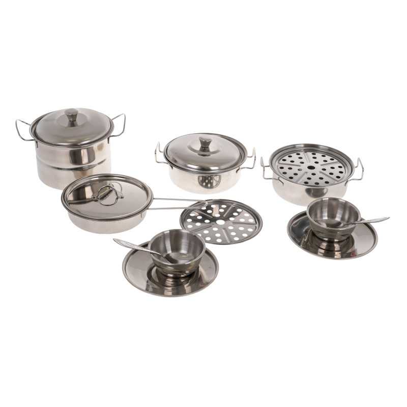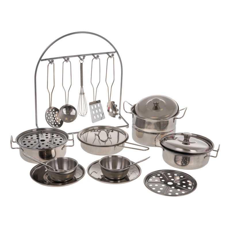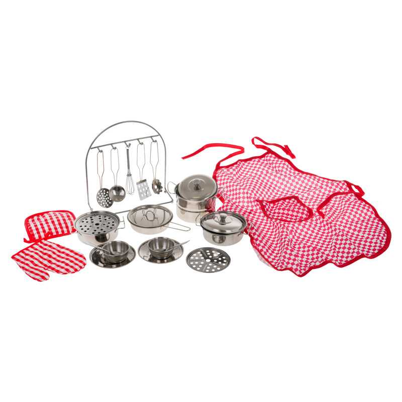 Patvarus metalinių puodų ir priedų rinkinys vaikams nuo 3 metų. Rinkinį sudaro daugybė elementų, būtinų kiekvieno vaiko virtuvėje. Čia yra puodų su dangčiais, virtuvės reikmenų, virėjo prijuostė, pirštinė, lėkštės, šaukštai ir kt. Pagamintas iš metalo, jis užtikrina patvarumą ir tvirtumą. |