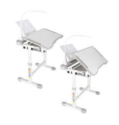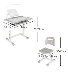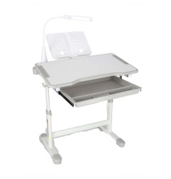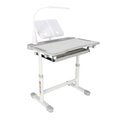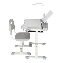 Vaikiškas rašomasis stalas su stalčiumi, kėdė, lempa, pilka