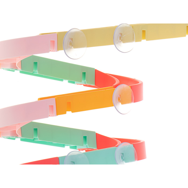 Žaislas turi siurbtukus, kuriais lengva pritvirtinti takelį prie plytelių ar vonios.