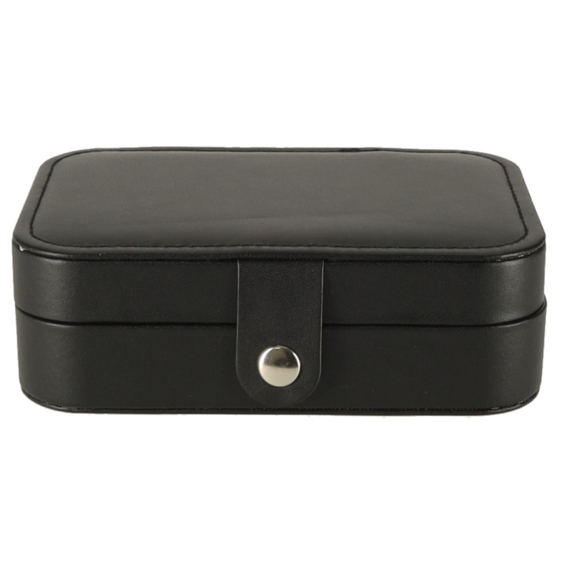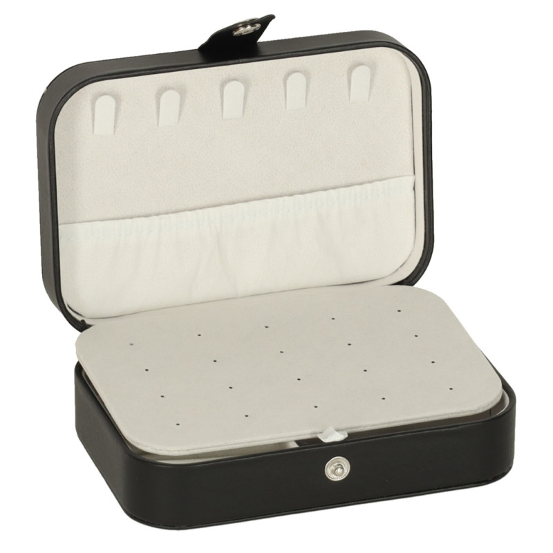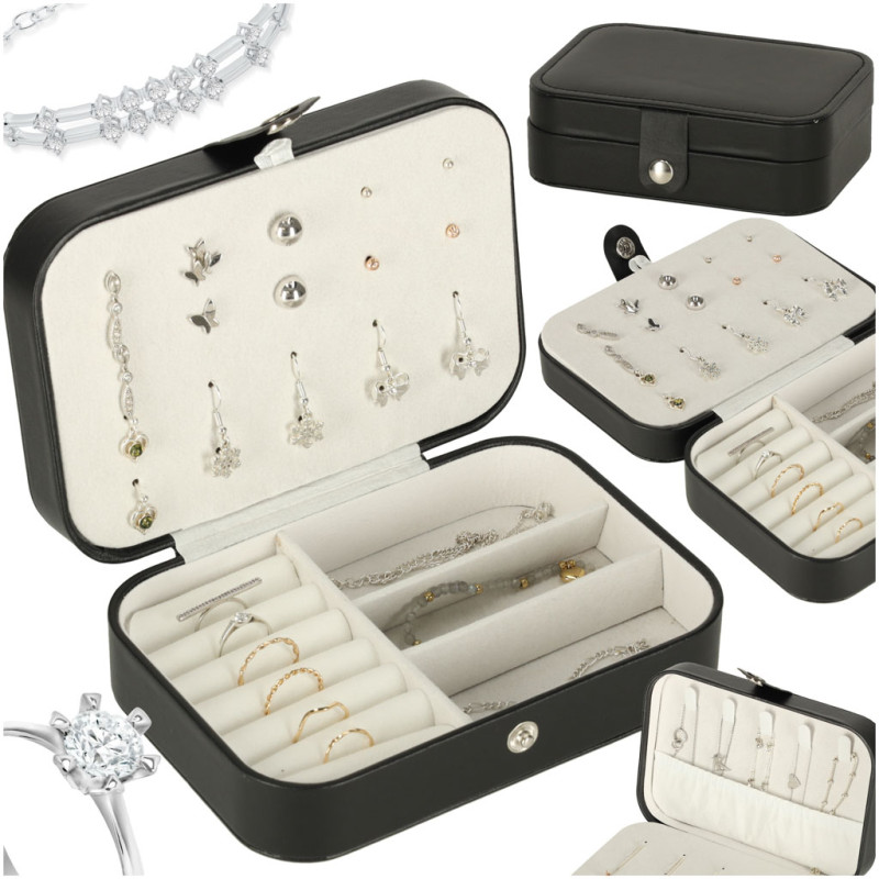 Tai stilinga elegantiška klasikinės juodos spalvos papuošalų dėžutėsu kontrastuojančiu šviesiu vidumi, kuri puikiai derės prie bet kurio tualetinio stalelio interjero. Taimoderni skrynelė, kurioje kompaktiškas dydis dera su įspūdingu funkcionalumu irstebinančia talpa. Dėl gerai apgalvoto skyrių, kabliukų ir vietų žiedams bei auskarams išdėstymo joje galima patogiai laikyti įvairiusjuvelyrinius dirb inius, kartu užtikrinant saugų net ir didesnės aksesuarų kolekcijos laikymą. Idealus pasirinkimas papuošalų mėgėjams, kurie vienameorganizatoriuje nori suderintistilių, modernų dizainą ir praktiškumą.