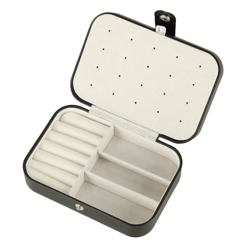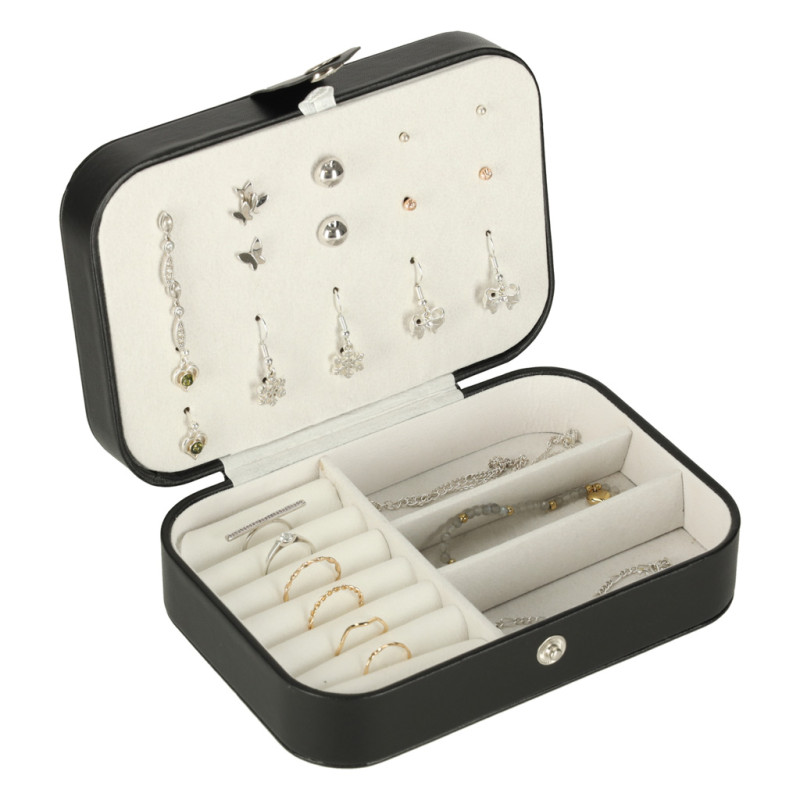 Šioje papuošalų dėžutėje yra du skyriai, 12 vietų žiedams, 10 vietų kabantiems auskarams, papildomi skyriai smulkmenoms ir 5 kabliukai su kišenėle vėriniams. Taip galėsite patogiailaikyti papuošalus ir išlaikyti puikią tvarką net ir turėdami didesnę papuošalų kolekciją.