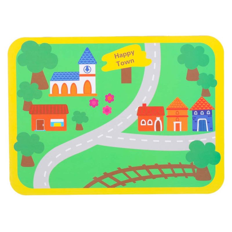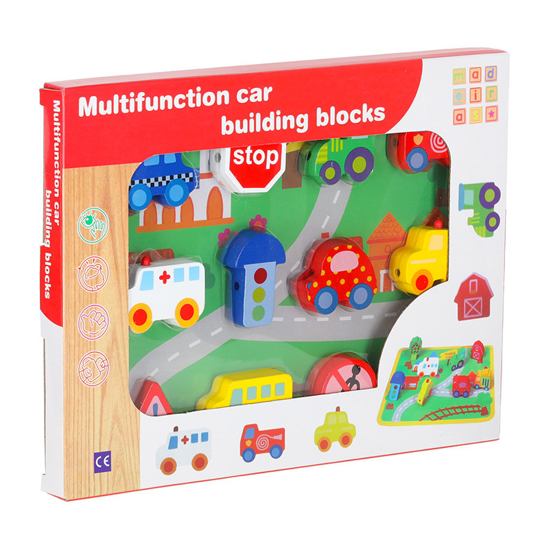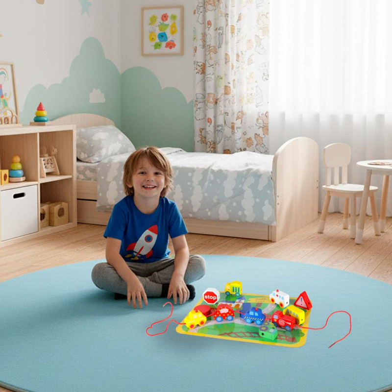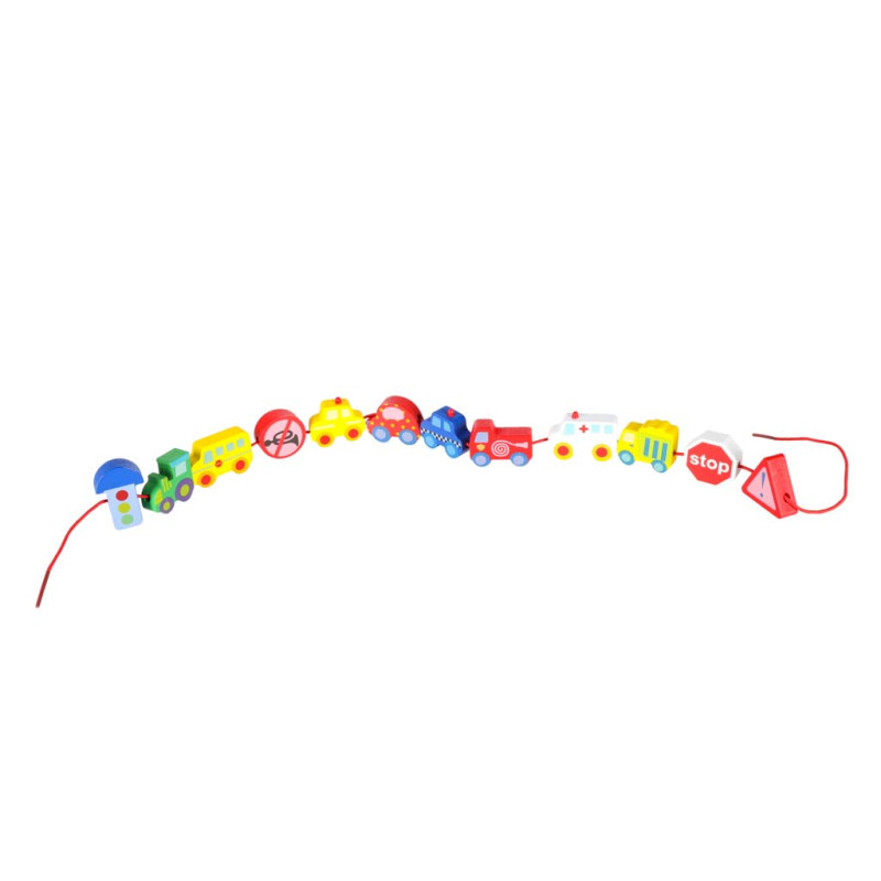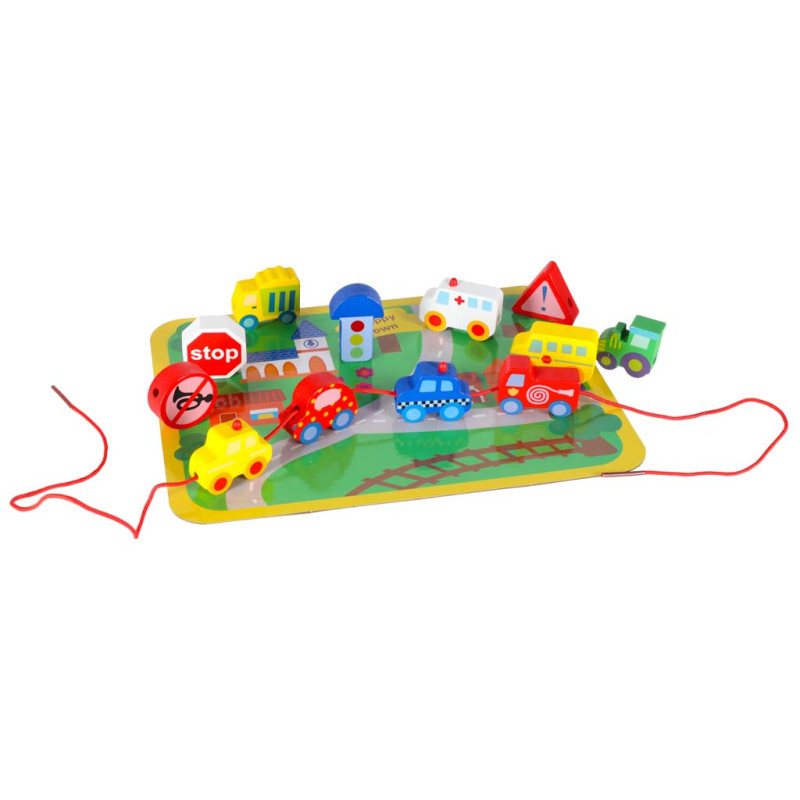 Kiekviena kaladėlė sukurta taip, kad padėtų lavinti smulkiąją motoriką ir lavinti rankų koordinaciją.Blokelius suveriant ant virvutės lavinama smulkioji motorika, mokomasi tikslumo ir kantrybės. Tai puiki mažylių treniruotė, leidžianti vaikui vystytis natūraliai ir džiaugsmingai. Žaisle yra spalvinga lenta, pagaminta iš patvaraus popieriaus, kurioje pavaizduotas spalvingas miestelis ir kuriįkvepia vaiką žaisti irkurti savo istorijas. Lenta yra puikus fonas medinėms kaladėlėms, padedantis lavinti erdvinę vaizduotę ir palengvinantis mokymąsi žaidžiant.