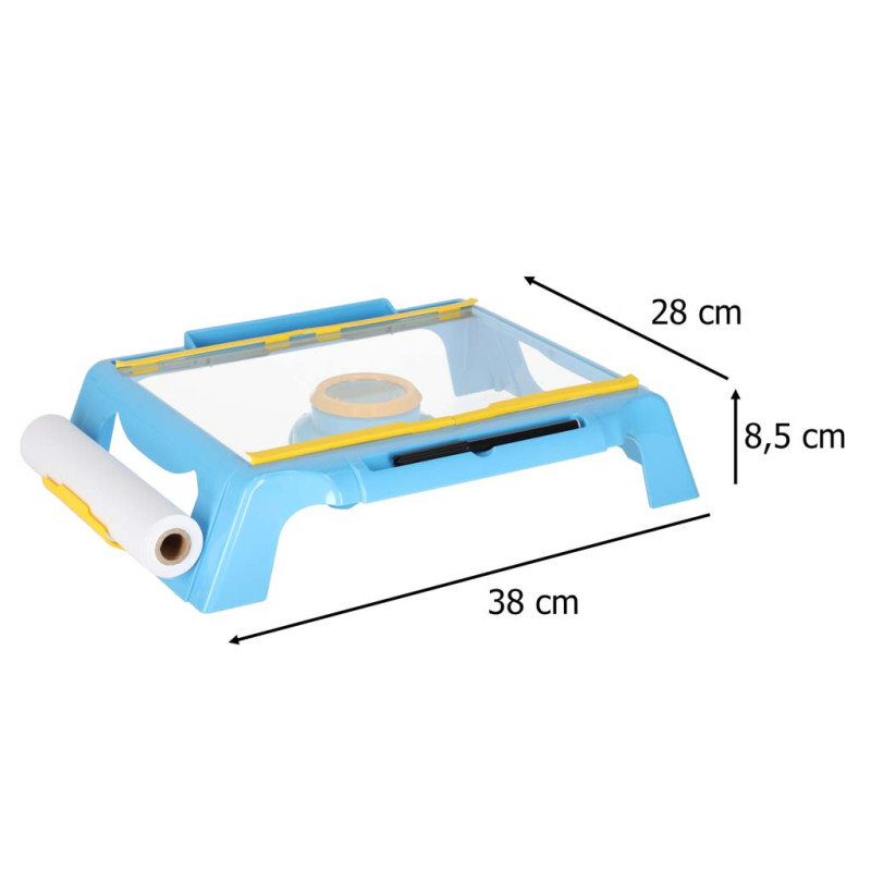 Rinkinyje rasite stabilų piešimo stalą, sukurtą atsižvelgiant į mažųjų patogumą ir saugumą. Stalas su projektoriumi - tai funkcionalumo irsmagumo derinys - su šiuo stalu jūsų vaikas gali kurti, kur tik panorėjęs! Piešimo rinkinyje su projektoriumi yra viskas, ko reikia kūrybiniam nuotykiui: ritinėlis piešimo popieriaus (tinka A4 formatas), 12 spalvotų žymeklių ir tiek pat kreidelių, 72 paveikslėlių rinkinys piešti pagal paruoštus šablonus, padedančius mokytis. Pramogauti paprasta - tereikia įdėti skaidrę, nustatyti projektorių ir galima pradėti žaisti!