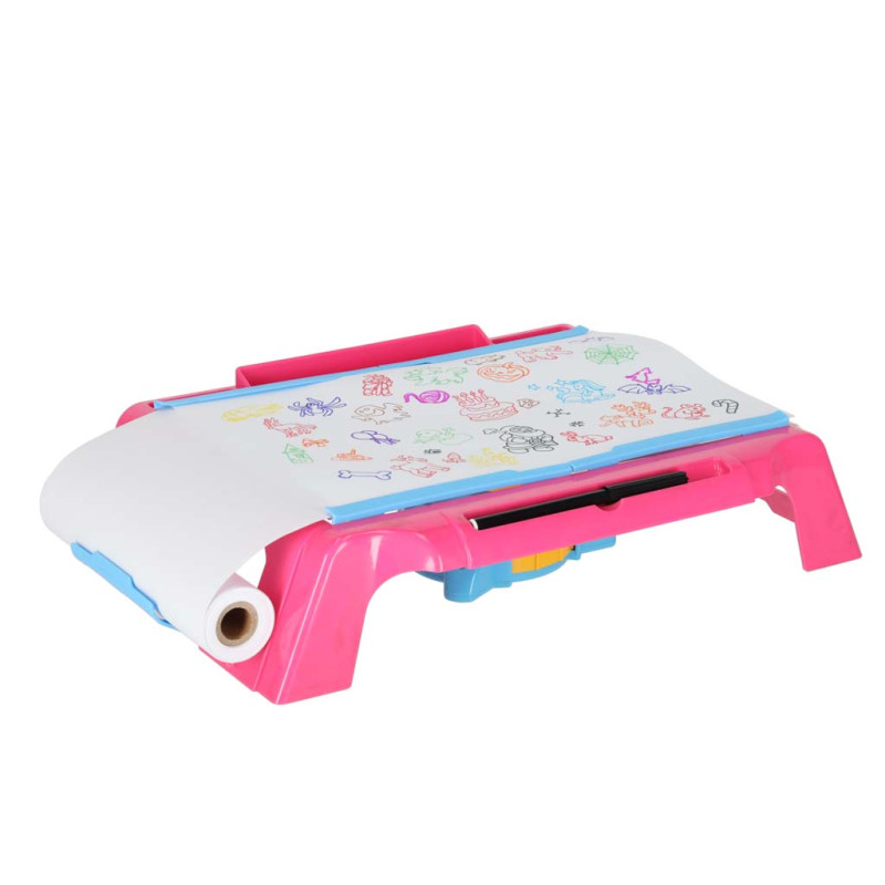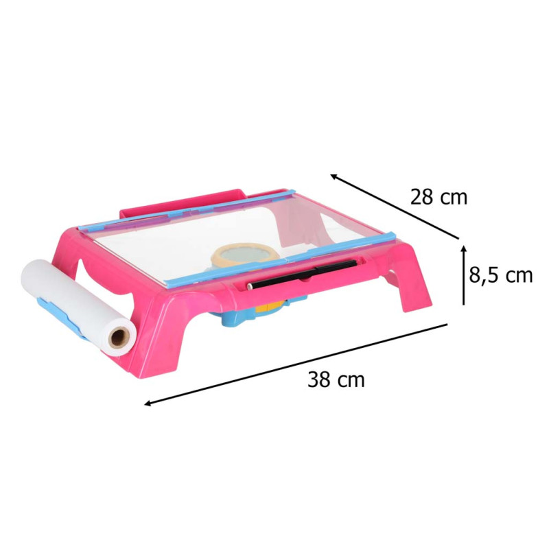 Šis spalvingas piešimo stalas su projektoriumi yra patogi irsaugi vieta mažiesiems menininkams. Naudodamasis šiuo stalu vaikas gali kurti kur tik nori - kambaryje, svetainėje ar net sode. Rinkinyje rasite viską, ko reikia: ritinėlį piešimo popieriaus, 12 spalvotų žymeklių, rinkinį su piešimo reikmenimis ir paruoštus modelius, su kuriais lengva pradėti piešti. Žaisti su rinkiniu yra vaikiškas žaidimas - įdėkite kaladėlę, nustatykite fokusą ir leiskite savo vaizduotei įsibėgėti!