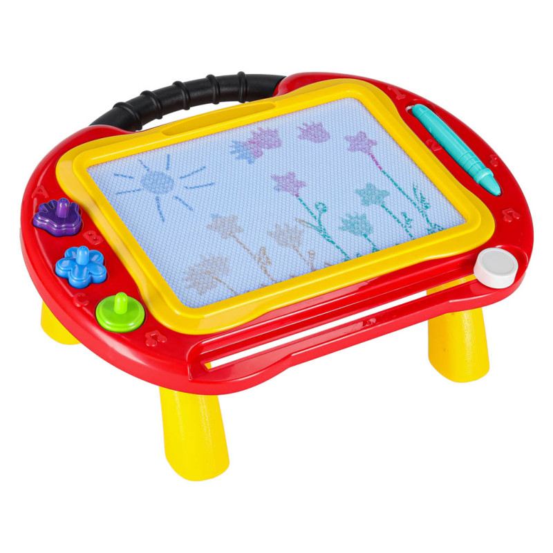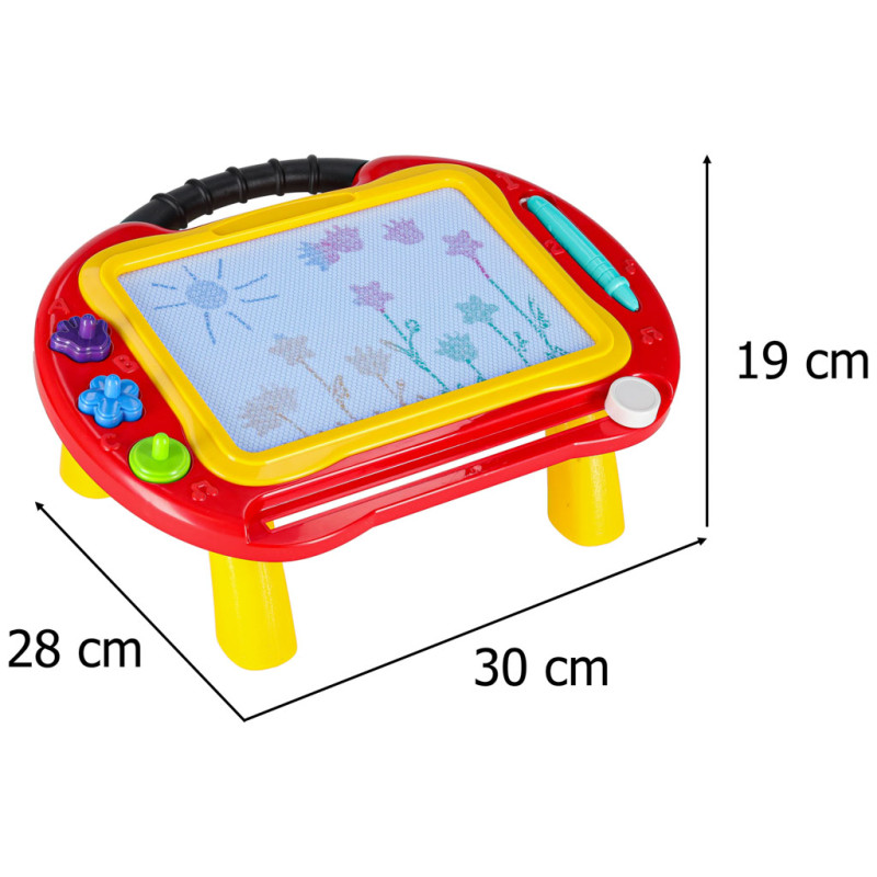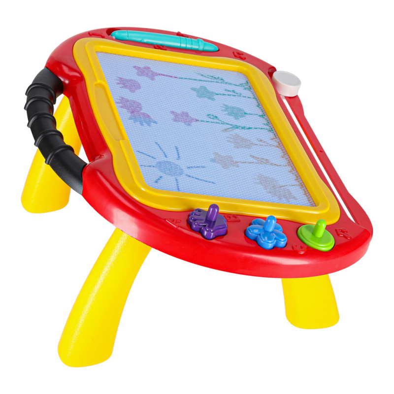 Dėl pritvirtintų kojelių lentą galima naudoti sėdint ir laikantis geros laikysenos. Ji turi patogią rankeną, kuria ją galima bet kur perkelti. Atjungus kojeles, lentą galima pasiimti į kelionę. Žaisdami su dingstančiu rašikliu ir antspaudais vaikas ilgai užims savo laiką.