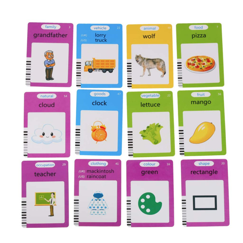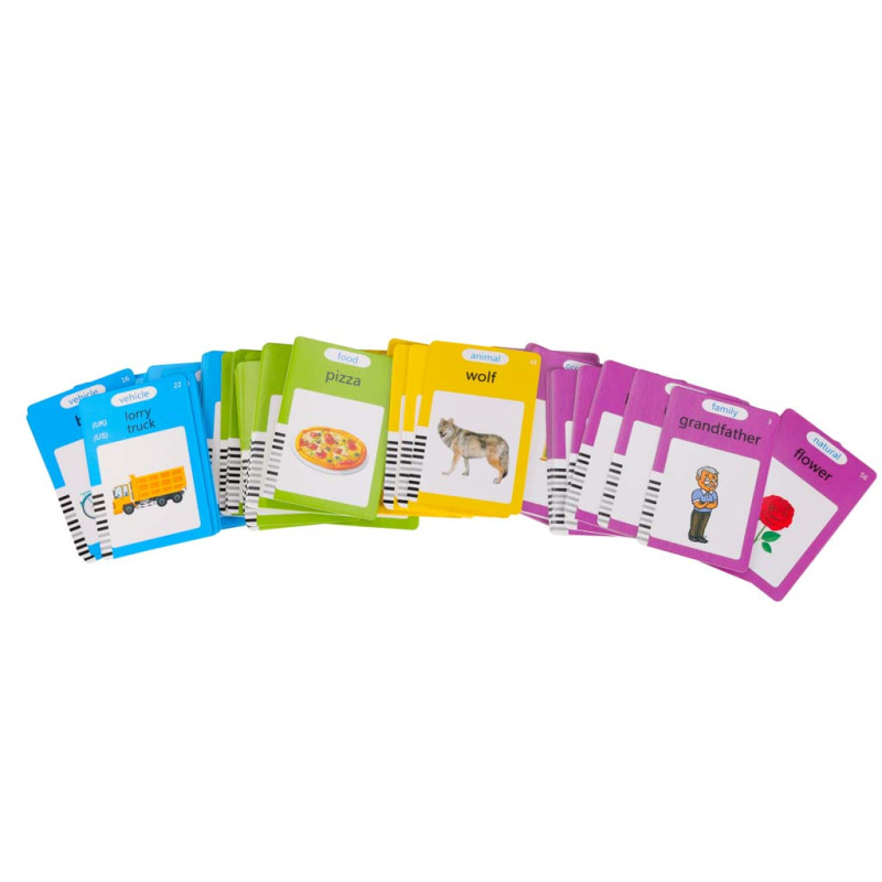 Rinkinyje yra iki 112 dvipusių kortelių - taididžiulis ir platus žodžių spektras, padedantis vaikui smagiai ir patraukliai lavinti kalbą ir suprasti kalbos mokymosi pagrindus. Rinkinyje yra kortelių, kuriose pavaizduoti gyvūnai, transporto priemonės, spalvos, šeima, drabužiai, profesijos, aplinka, vaisiai, daržovės, maistas ir kasdieniai daiktai. Todėl mokytis naujų žodžių niekada nebus nuobodu!