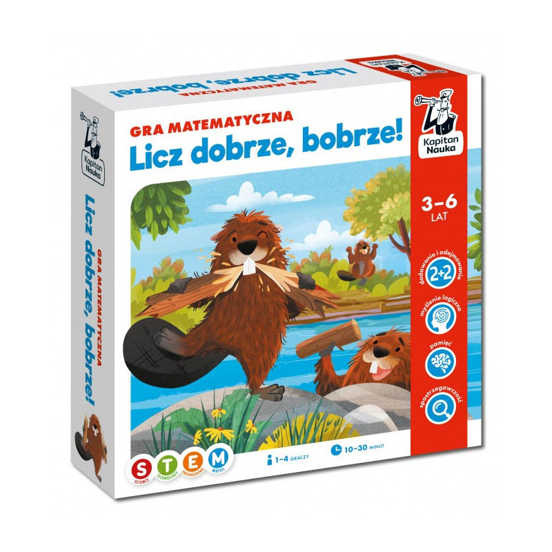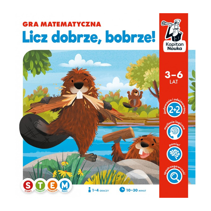 "Gerai skaičiuok, bebrai" (3-6 m.) - tai skaičiavimo žaidimas ikimokyklinukams, kurio dėka jie gali tapti matematinio tetrio meistrais. Žaidėjai prisijungia prie išradingų bebrų komandos ir lenktyniauja tarpusavyje dėliodami medienos sijas. Laimi tas, kuris pirmas iš jų pastatys užtvanką. Žaidėjai gali pasirinkti vieną iš dviejų žaidimo tipų - jie gali skaičiuoti iki 10 arba iki 20. Naudodamiesi lenta su užuomina, jie piešia medžio sijas ir sugalvoja, kaip jas išdėstyti, kad kuo greičiau sukurtų užtvanką. Specialių žetonų dėka jie gali nuspręsti, kokio ilgio sijos jiems reikia, ir tuo pat metu praktikuotis sudėti ir atimti. Laimi tas, kuris parodo refleksus, gudrumą, skaičiavimo įgūdžius ir loginį mąstymą. Skaičiuok gerai, bebro - tai itin įtraukiantis žaidimas ikimokyklinio amžiaus vaikams. Jo mechanika pagrįsta STEM metodu, i.e. novatorišku požiūriu į mokymąsi, kuris ugdo matematinį ir loginį mąstymą bei kompetencijas, būtinas naujųjų technologijų pasaulyje, sudarant galimybes priimti iššūkius ir spręsti problemas. Kartu žaidimas moko sveikos konkurencijos. Tai taip pat puikus būdas ugdyti susikaupimą, išradingumą ir atkaklumą ieškant sprendimų. Žaidimai gali būti pritaikomi prie žaidėjų matematinių įgūdžių, todėl bebrų lenktynėse gali dalyvauti įvairaus amžiaus ir temperamento ikimokyklinukai. Lentos ir žetonai pagaminti iš storo kartono, kuris garantuoja patvarumą net ir per įdomiausius žaidimus. Iš eksperto perspektyvos Puikus žaidimas vaikams, kurie jau pažįsta skaičius ir dabar mokysis sudėti ir atimti nuo 1 iki 20. Įsijautę į darbščių bebrų vaidmenį, jie statys užtvanką ir kartu lavins gebėjimą lyginti skaičius ir įžvelgti matematinius ryšius. Įtraukiantis žaidimas su draugiškais gyvūnais - labai rekomenduoju! Kinga Gałązka - matematikė, Ugdymo plėtotės centro ekspertė, Lodzės vaivadijos mokytojų rengimo centro konsultantė Plėtra sudėtis ir atimtis, loginis mąstymas, atmintis, suvokimas |