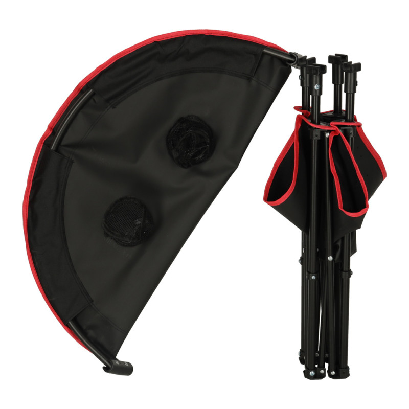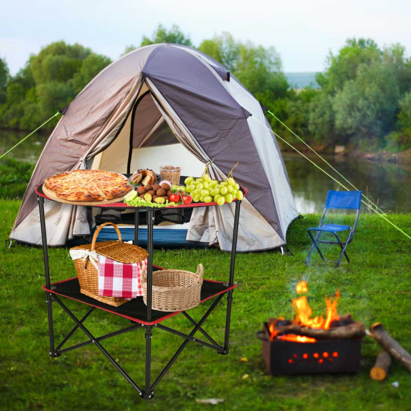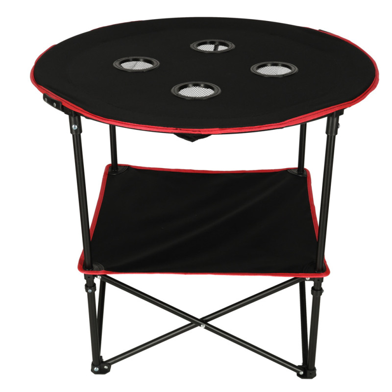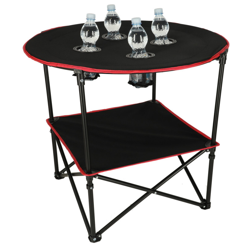 Išplečiamas kelioninis stalas, kuriame telpa 4 gėrimai ir krepšys