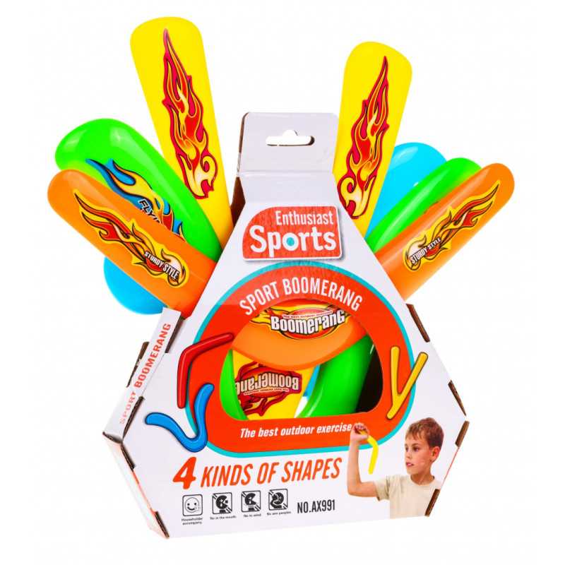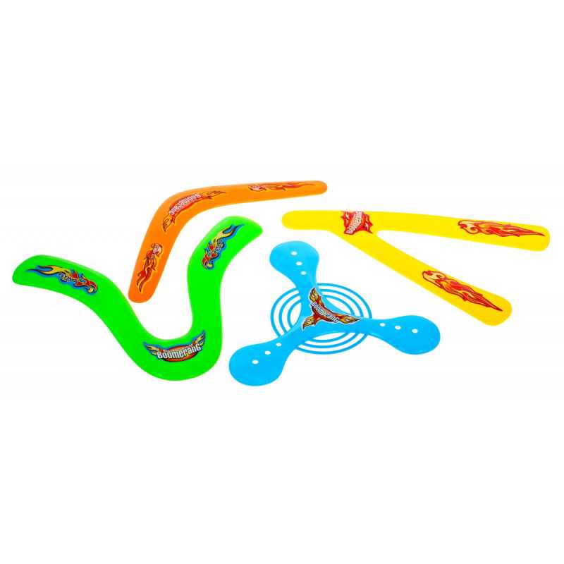 4 įvairių spalvų ir formų bumerangų rinkinys yra sportinis žaislas, skirtas vaikams nuo 3 metų. Jis suteiks jūsų vaikui galimybę kūrybiškai žaisti gryname ore. Žaidžiant su bumerangu lavinamas vikrumas, tikslumas, dėmesys ir reakcija. Su bumerangu galima žaisti vienam arba komandoje.