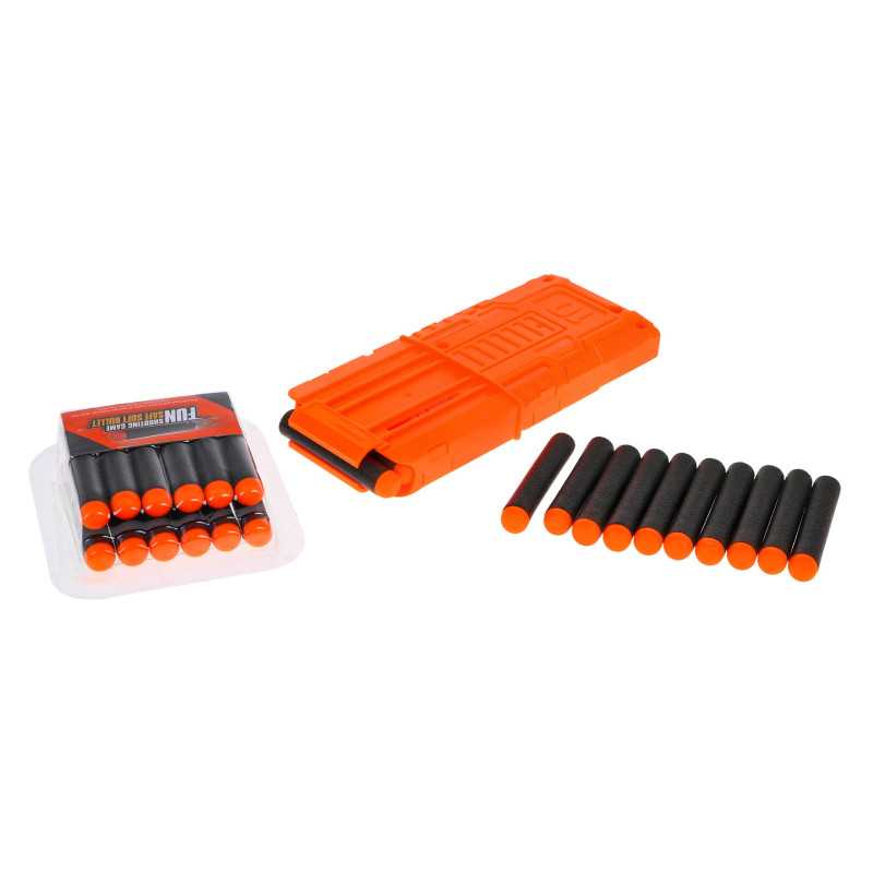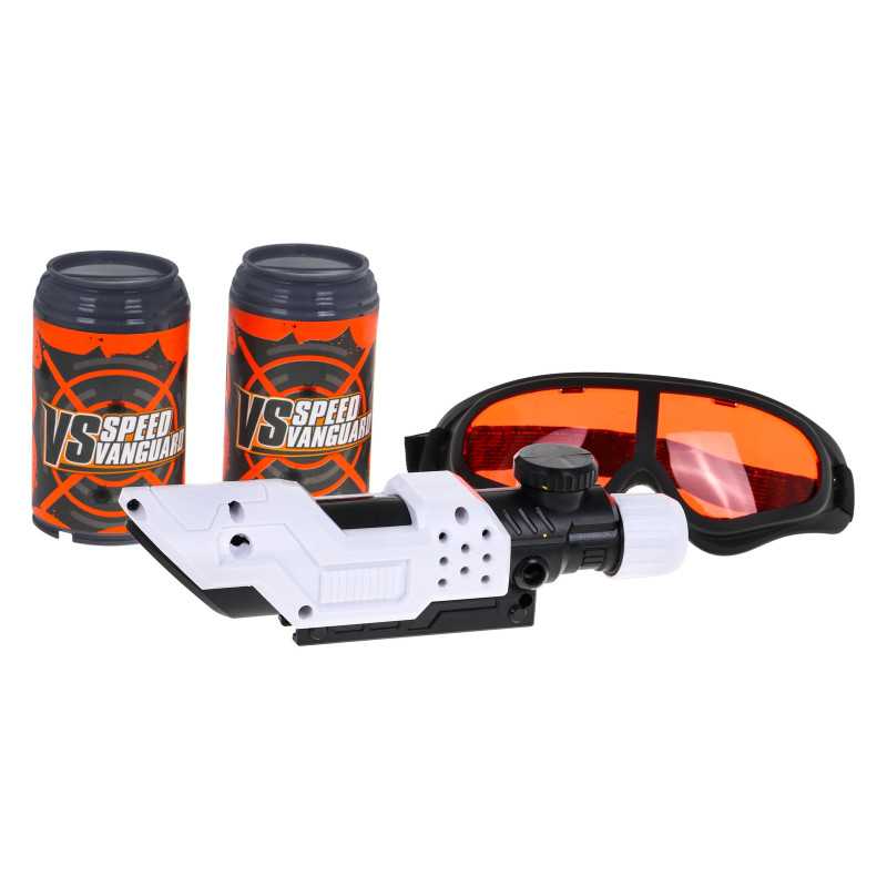Rinkinį sudaro 24 minkštos putplasčio kulkos su guminiu antgaliu, 4 imitacinės skardinės - taikiniai ir apsauginiai šaudymo akiniai su elastine juosta.