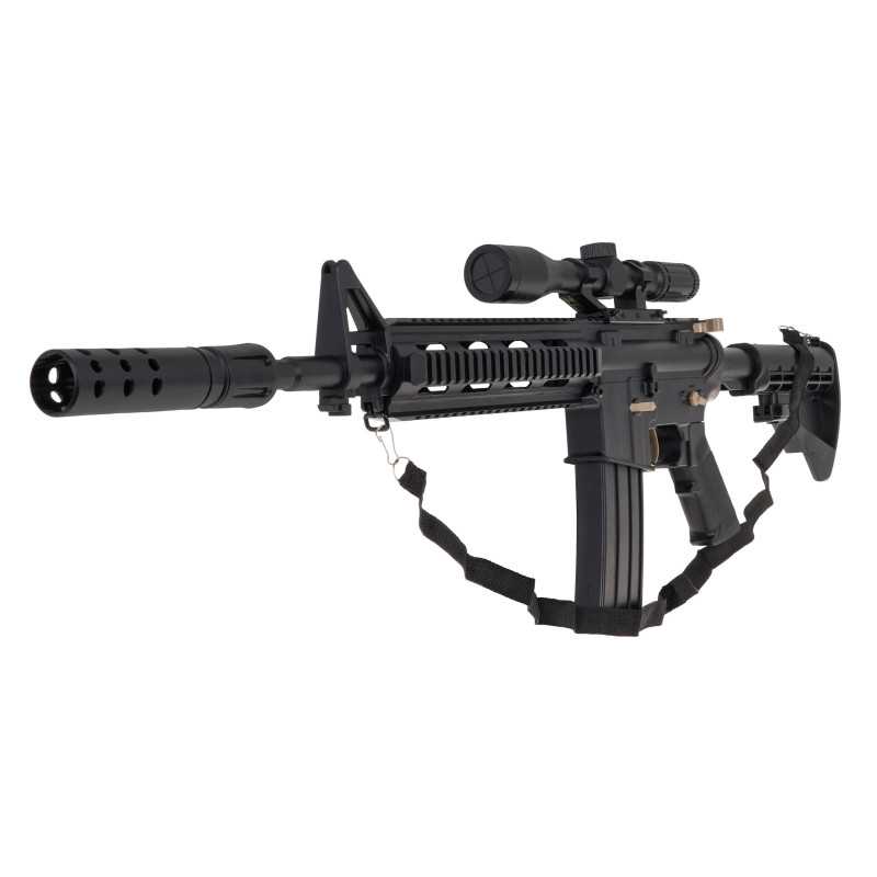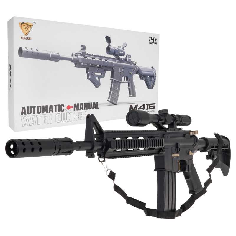 Didelis M4 karinis šautuvas su gelinėmis kulkomis skirtas vaikams nuo 14 metų. Jį reikia naudoti su specialiais hidrogelio formos rutuliukais, kurie sprogsta, kai pataiko į taikinį. Šiame modelyje reikėtų naudoti 7-8 mm skersmens rutuliukus. Rinkinyje yra neparuoštų kamuoliukų paketėlis. Kamuoliukai paruošiami užpylus juos vandeniu ir palikus maždaug 4-6 valandoms, tada nupilti vandens perteklių ir šoviniai paruošti. Šautuvas turi rankinį ir automatinį šaudymo režimus. Ginklo taikiklyje yra didinamasis stiklas, o taikinio atstumą galima reguliuoti rankenėle. Žaislą maitina komplekte esanti 3, 7 V baterija. | |