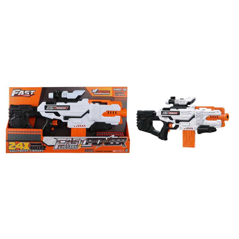 Pusiau automatinis šautuvas su taikikliu ir minkštų kulkų dėtuve vaikams nuo 8 metų. Šautuvą lengva valdyti, tereikia įkrauti dėtuvę, paspausti ir palaikyti įjungimo mygtuką, nusitaikyti ir nuspausti gaiduką. Žaislas maitinamas 6 x AA 1, 5 V baterijomis, baterijos į komplektą neįtrauktos.
