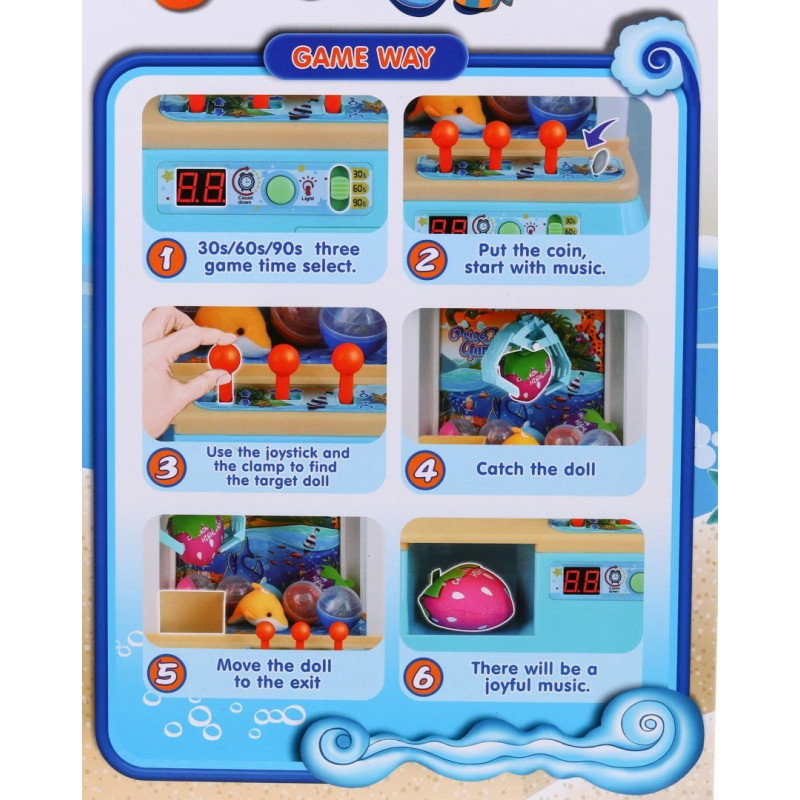| Kiekvienas iš mūsų žino prekybos centruose populiarius automatus, kuriuose galima pagauti talismaną. Pristatome mažesnę versiją, mažą automatą, kuris kiekvienam suteiks daug džiaugsmo. Žaidimas turi garso ir šviesos efektus. Galime rinktis iš 3 sudėtingumo lygių: 30 s, 60 s, 90 s. Žaidimas prasideda įmetus plastikinę monetą (rinkinyje 12 vnt.). Žaidimo tikslas - pagauti kamuoliuką (rinkinyje 10 vnt.) mašinoje esančiu griebtuvėliu, priklausomai nuo sudėtingumo laipsnio turime 30 s, 60 s arba 90 s. Bandant gaudyti mus lydi nuotaikinga muzika. Į kamuoliuką galime įdėti staigmeną, tada žaidimas tampa įdomesnis. Be kamuoliukų, galime įdėti ir smulkių žaisliukų, talismanų ir pan. Žaidimas turi du garsumo režimus, taip pat galimybę įjungti ir išjungti apšvietimo efektus. Mašinėlė veikia nuo 3 x 1, 5D baterijų (į komplektą neįeina) arba nuo USB laido (įeina į komplektą). Žaislas skirtas vaikams nuo 3 metų, turi CE sertifikatą. | |