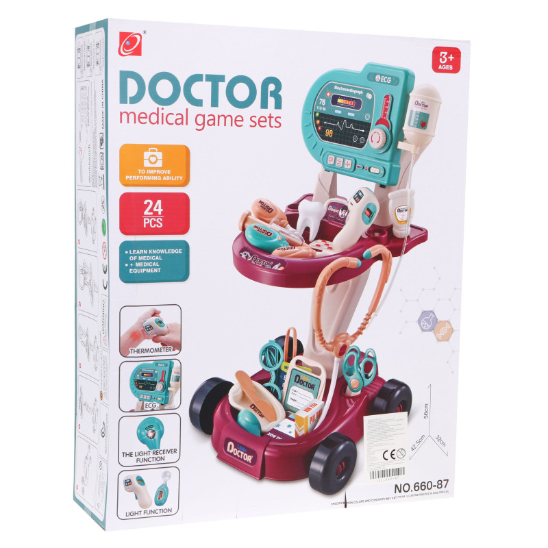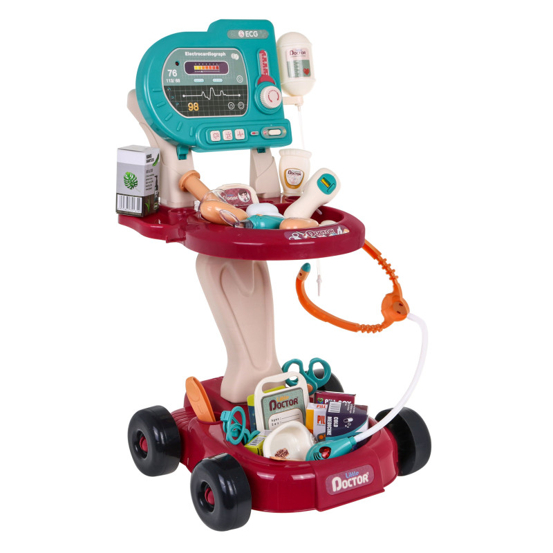 | Saugus, spalvingas interaktyvus rinkinys su garso ir šviesos efektais vaikams nuo 3 metų. Žaislas sukonstruotas kaip patogus vežimėlis ant ratukų, kurį galima greitai perkelti į bet kurią vietą. Į rinkinį įeina 24 priedai, reikalingi norint žaisti mažąjį gydytoją. EKG skydelis atlieka šviesos (mirksintis raudonas diodas) ir garso (matavimo garsas, signalas, širdies plakimas) funkciją, jį maitina 2 x AA 1, 5 V baterijos (į komplektą neįeina). Stetoskopas ir termometras taip pat turi šviesos ir garso efektą. Stetoskopas skleidžia širdies plakimo garsą ir signalizuoja apie jį raudonu šviesos diodu. Termometras skleidžia matavimo garsą, o raudonas šviesos diodas šviečia. Diagnostinis veidrodėlis turi foninį apšvietimą. | |