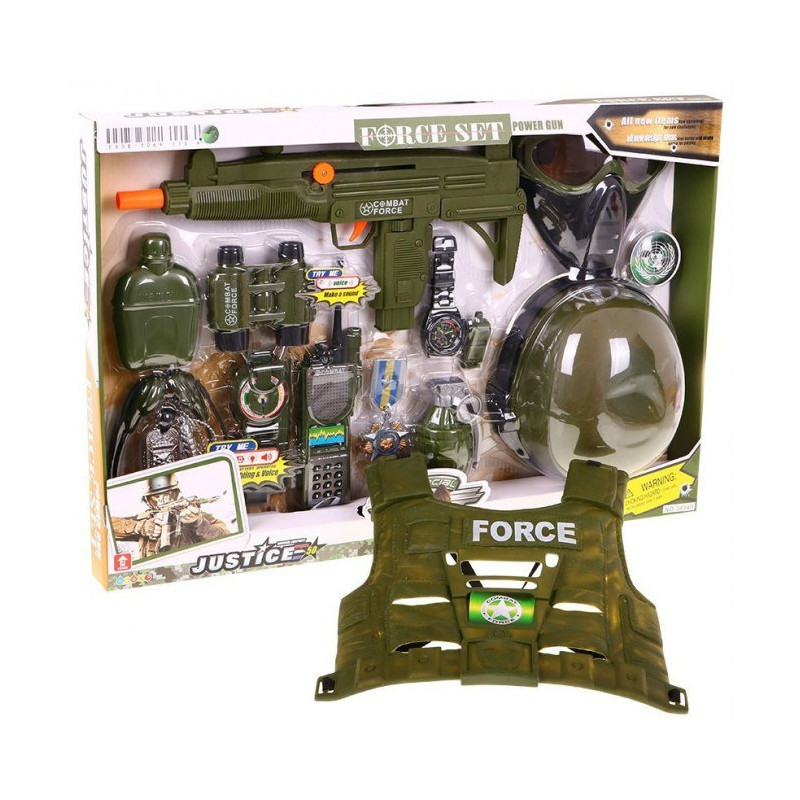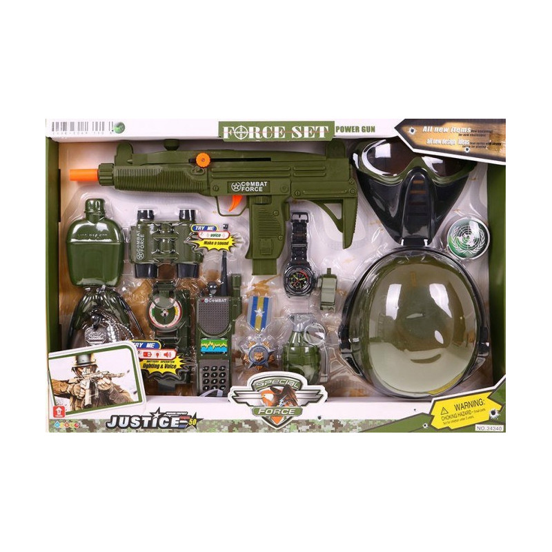 | - užsegama neperšaunama liemenė, - kaukė su akiniais, - kepurė - šalmas, - kulkosvaidis su taikikliu, - žiūronai - granata su kojele, - laikrodis, - švilpukas, - ženkliukas - ordinas / medalis už nuopelnus, - trumpųjų bangų radijas / radijo imtuvas (maitinamas baterijomis), - kompasas, - ausinės, - peilis / pelekas (saugus - plastikinis), - mišrainė, - raktų pakabukas, - spalvinga pakuotė, idealiai tinkanti dovanai. |