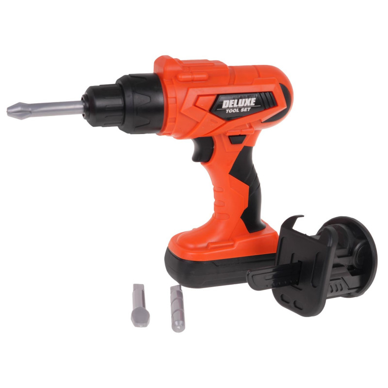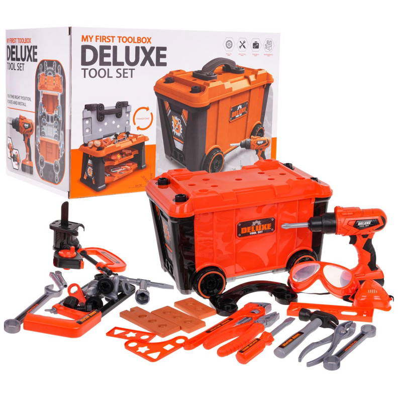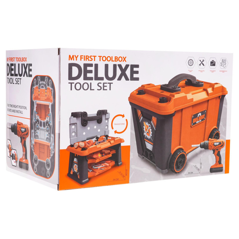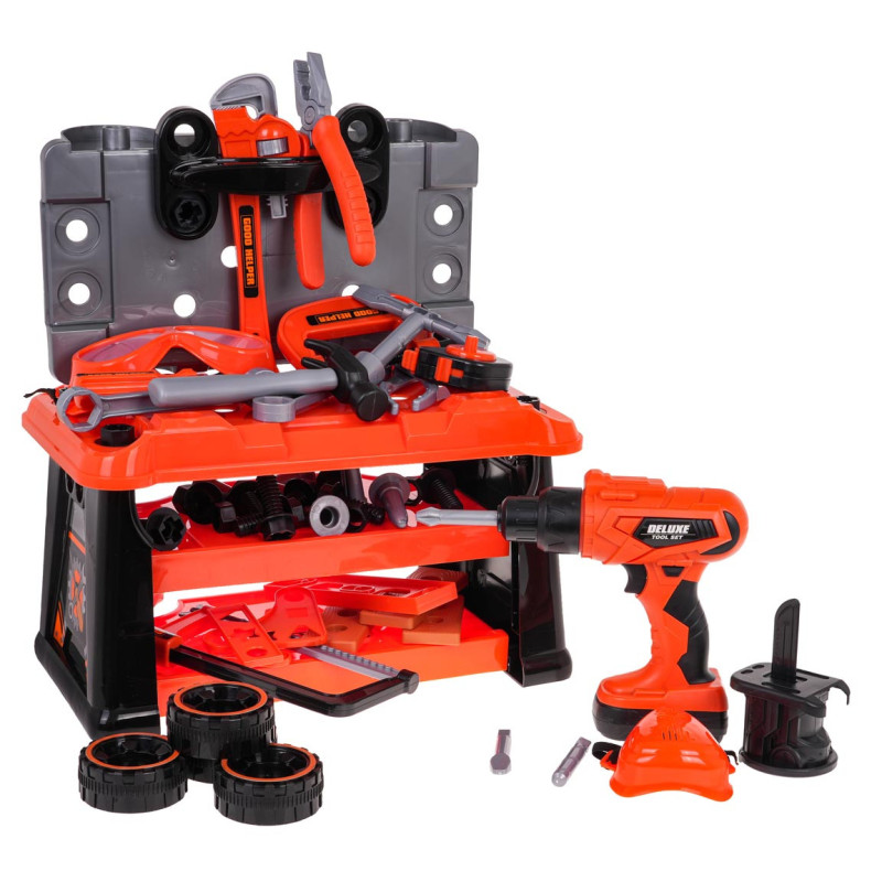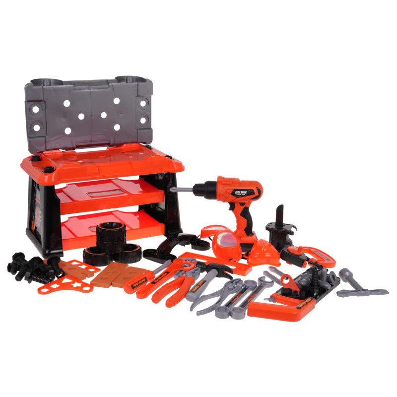 Gausiai aprūpintas 2 in 1 įrankių rinkinys mažiesiems "pasidaryk pats" entuziastams nuo 3 metų. Iš rinkinio galime pasigaminti darbo stalą, o pažaidę jį paversti į rinkinyje esančių įrankių lagaminėlį. Rinkinyje yra 65 elementai, pavyzdžiui, dirbtuvių sudedamosios dalys, įrankiai, pjūklas, atsuktuvai, akumuliatorinis gręžtuvas, daugybė varžtų ir kt. Atsuktuvas maitinamas 2 x 1, 5 V AA tipo baterijomis, baterijos į komplektą neįtrauktos. Grąžtas-suktuvas veikia kaip tikras, atsuka, atsuka varžtus, taip pat turi nuimamą akumuliatorių, 3 keičiamus antgalius ir pjūklo antgalį. |