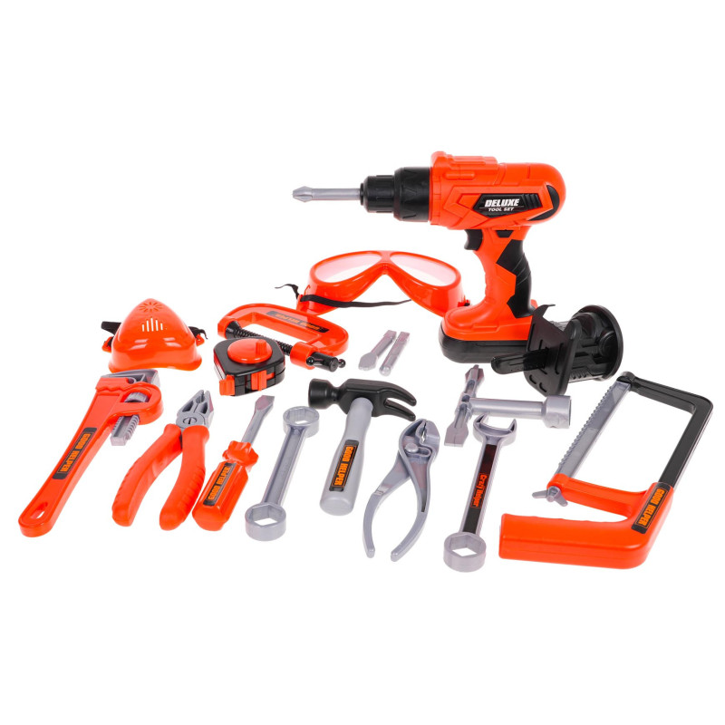 - darbo stalas maždaug 25 cm x 21, 8 cm x 34 cm, - dėžė apie 39 cm x 21, 8 cm x 34 cm, - maždaug 17 cm x 16 cm x 5 cm, - plaktukas apie 15 cm x 8, 5 cm x 3 cm, - apie 16 cm x 5, 5 cm x 1, 5 cm dydžio žnyplės, - apie 15, 5 cm ilgio atsuktuvas, - maždaug 17, 5 cm ilgio veržliaraktis, - 14, 5 cm ilgio žiedinis veržliaraktis, - raktas varžtams atsukti ir priveržti, apie 9 cm x 11 cm, - maždaug 25 cm x 10 cm x 2, 5 cm rankinis pjūklas, - galas su mechaniniu pjūkleliu apie 11 cm x 8 cm, - maždaug 5 cm x 3 cm dydžio smeigtukas, - varžtas apie 4, 5 cm x 3 cm, - maždaug 13, 3 cm x 7 cm x 2 cm, - maždaug 23 cm x 6 cm x 2 cm dydžio veržliaraktis, - apsauginiai akiniai, maždaug 16 cm x 6, 5 cm x 4 cm, - apie 6, 5 cm x 5, 5 cm, - apsauginė kaukė apie 8, 5 cm x 8 cm x 3, 5 cm, - maždaug 35, 5 cm x maždaug 22 cm x 22, 5 cm dydžio pakuotė. |