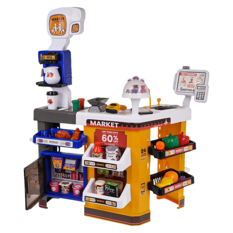 - parduotuvės konstrukciniai elementai, - pirkinių krepšelio struktūriniai elementai, - skeneris su garsais ir šviesomis, - kasos aparatas su kortelių skaitytuvu, garsais ir šviesa, - pirkinių krepšelis ant ratukų, - kilnojamoji skalė, - mikrofonas, - kasos aparatas atidaromas raktu, - du kasos aparato raktai, - telefono imitacija, - mokėjimo kortelę, - monetų (2 x 20, 2 x 10, 2 x 5), - banknotai (5 x 5, 5 x 10, 5 x 25), - dekoratyviniai lipdukai, - du kavos puodeliai, - 2 x cukrus paketėlyje, - apelsinų sultys skardinėse, dėžutėse ir buteliuose, - įvairių vaisių sultys dėžutėse ir skardinėse, - vaisių pienas buteliuke, - jogurtas, - šokolado, - trys saldainiai, - 2 kiaušiniai, - raudonosios ir žaliosios paprikos, - citrina, - morkos, - bananų, - vynuogės, - oranžinės spalvos, - du kruasanai, - dešra, - picos, sušių, sausainių, sausainių, kavos ir pieno, - kavos puodelis, - 2 x ledų konteineris, - kavos puodelis. |