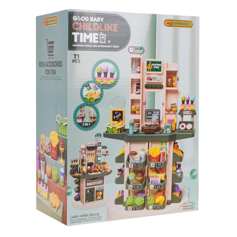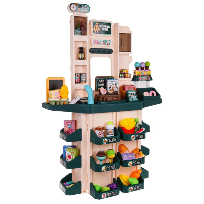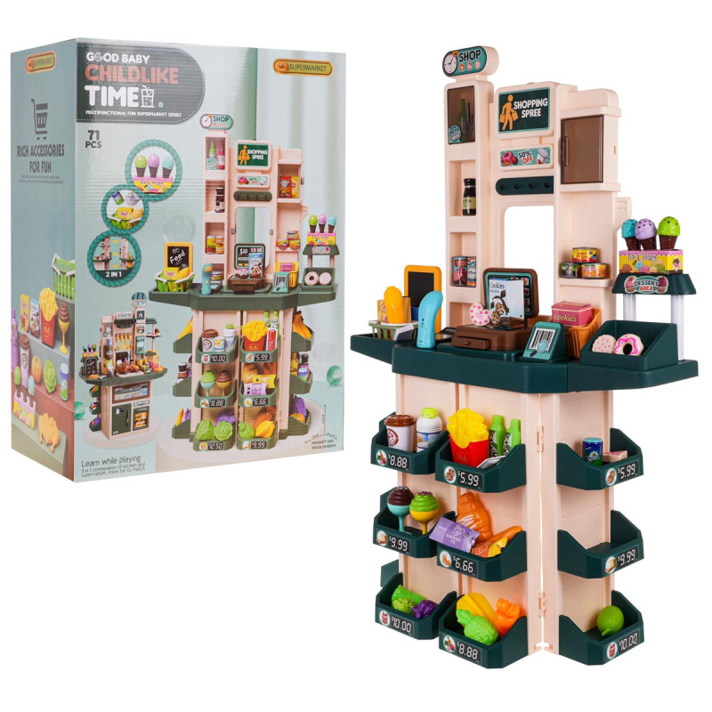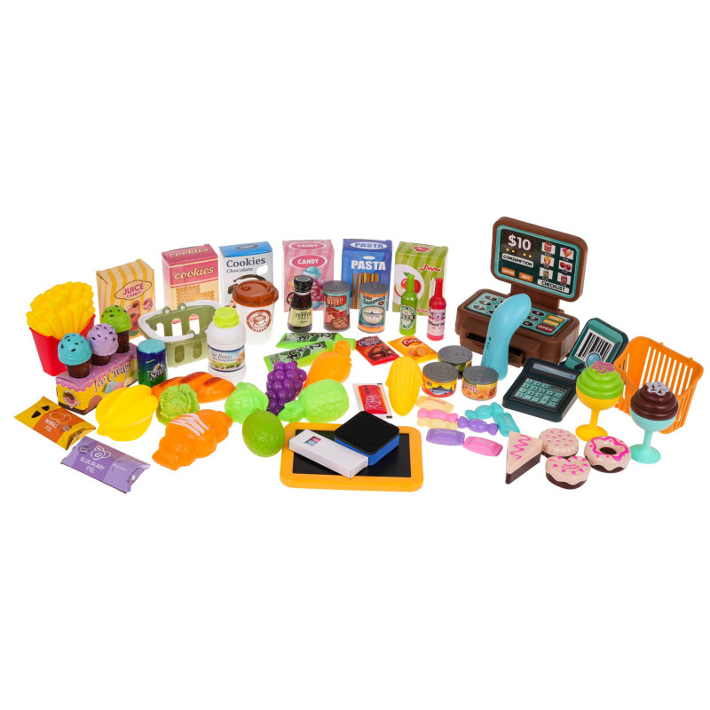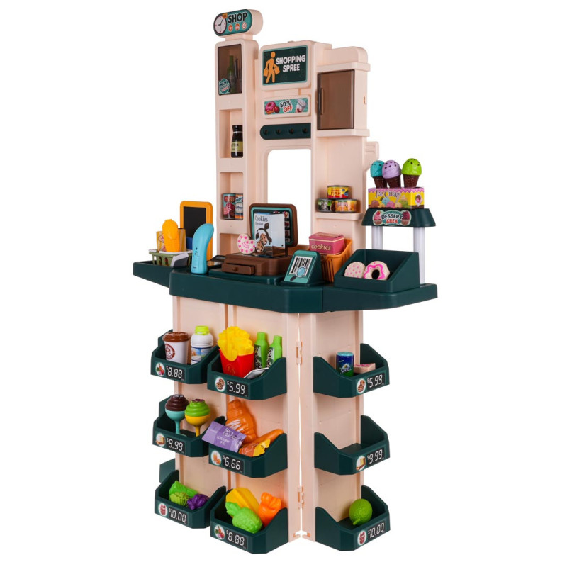 Gausiai aprūpintas parduotuvės prekystalis su daugybe priedų, skirtas vaikams nuo 3 metų amžiaus. Rinkinys pagamintas iš geriausios kokybės plastiko, ryškiomis spalvomis, kurios patraukia vaiko dėmesį ir skatina žaisti. Be didelio maisto produktų imitacijų skaičiaus, mes taip pat turime piešimo lentą, kasos aparatą su ištraukiamu stalčiumi, skaičiuotuvą, brūkšninio kodo skaitytuvą ir skenerį su garso bei šviesos efektais. Rinkinys turi daugybę lentynėlių, kuriose tilps visi rinkinyje esantys priedai. Skeneris maitinamas 3 x AG13 baterijomis (pridedamos).