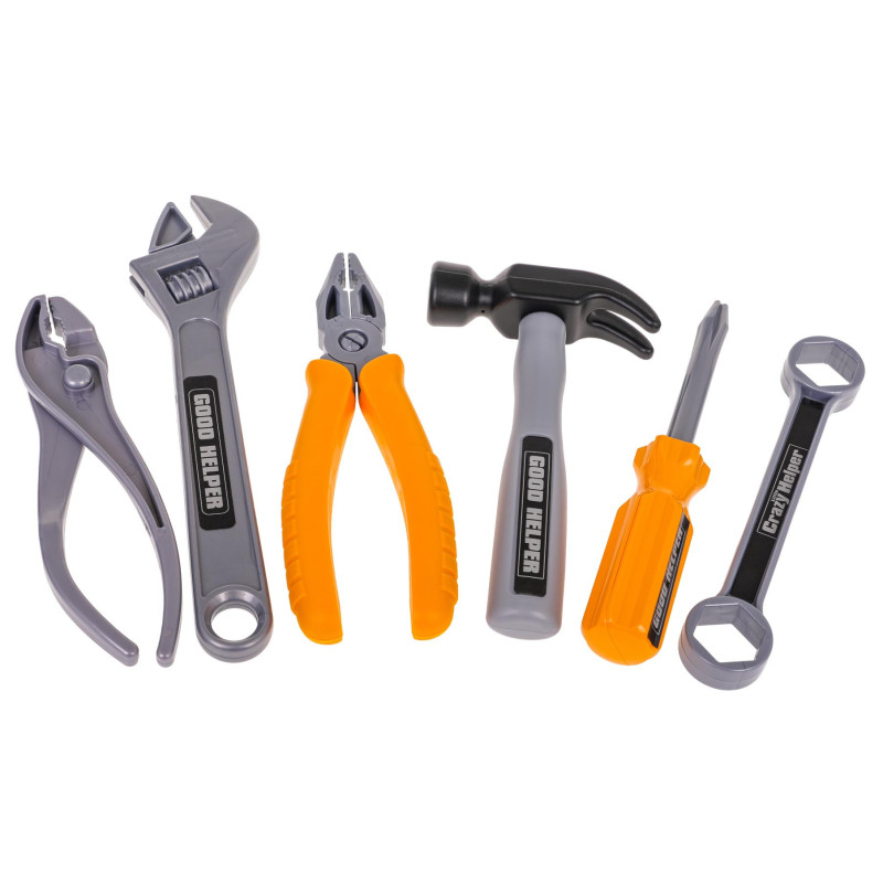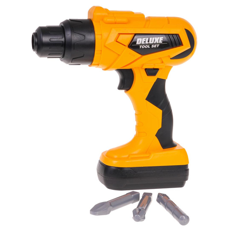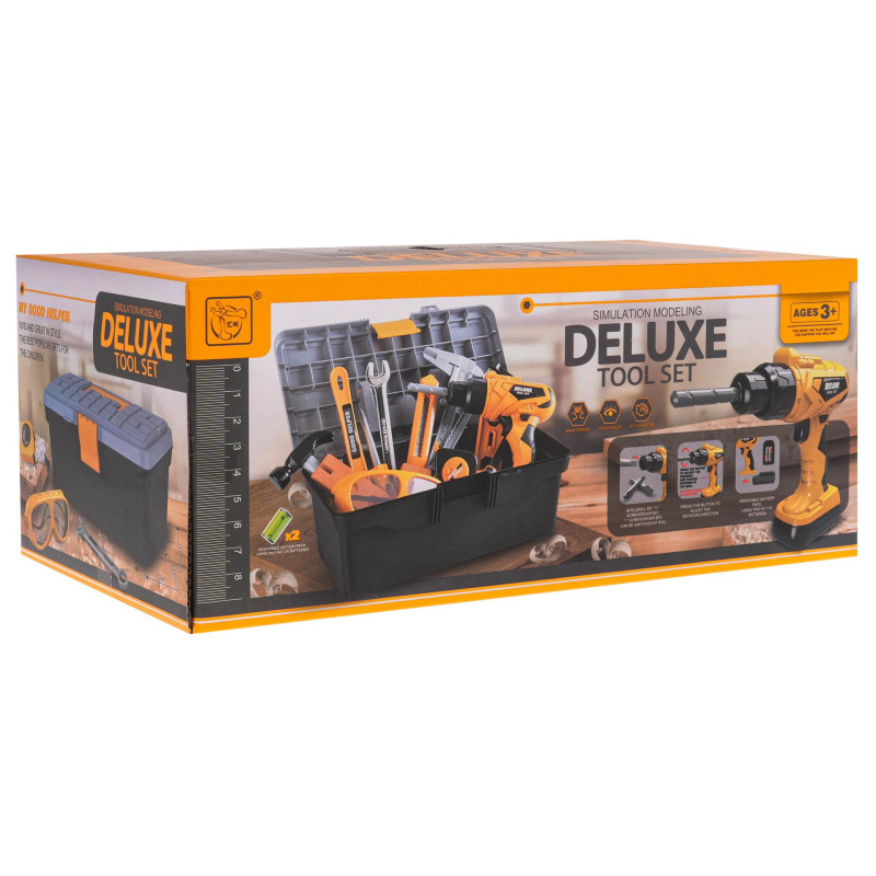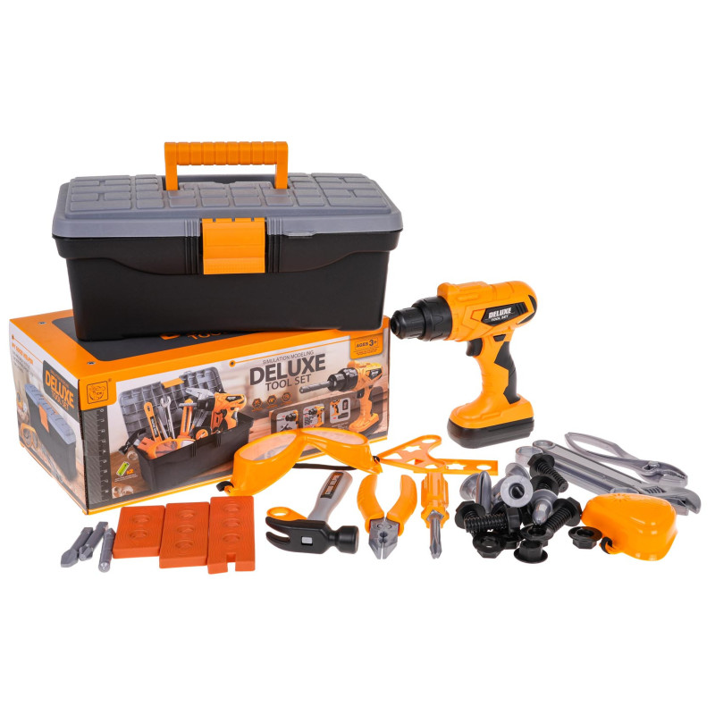 Gausiai aprūpintas įrankių rinkinys su interaktyviu gręžtuvu ir įrankių dėže, skirtas vyresniems nei 3 metų vaikams. Rinkinys pagamintas iš geriausios kokybės plastiko ir turi net 37 elementus. Be didelės, profesionaliai atrodančios įrankių dėžės, rinkinyje taip pat yra: interaktyvus gręžtuvas su keičiamais antgaliais, apsauginiai akiniai, kaukė, atsuktuvas, plaktukas, prancūziškas veržliaraktis, replės, žnyplės ir daugybė varžtų, priedų bei medžio, skirto varžtams prisukti. Gręžtuvą maitina 2 x AA 1, 5 V baterijos (į komplektą neįeina). Jis įsuka ir atsuka varžtus, turi keičiamus antgalius ir keičiamą akumuliatorių.