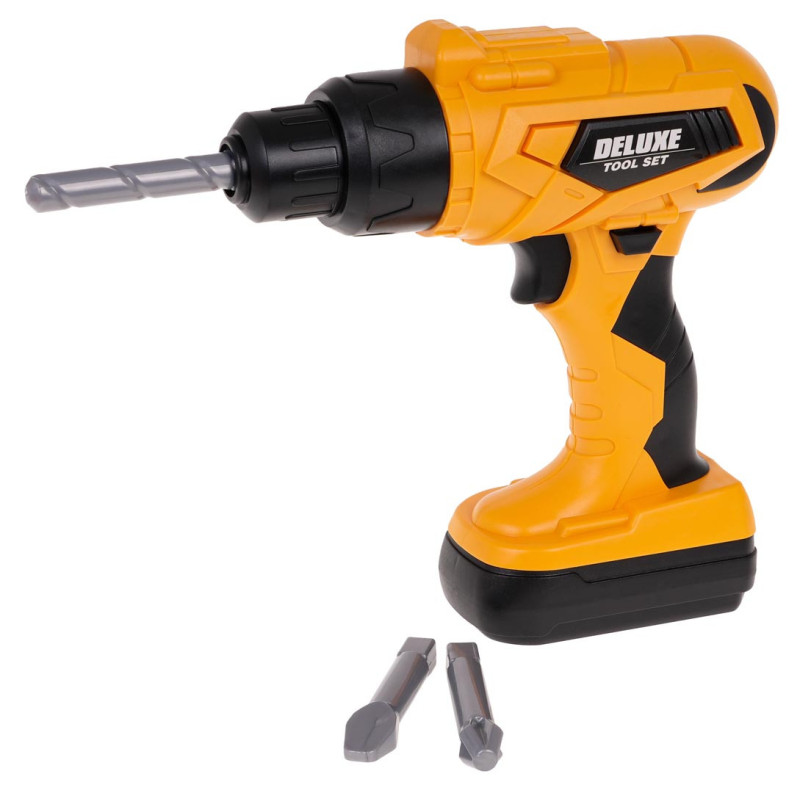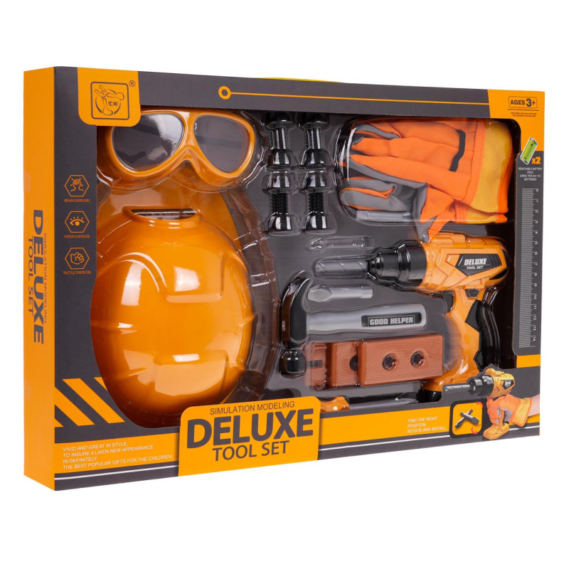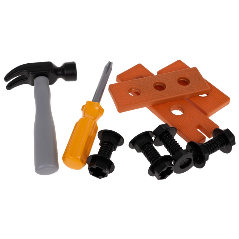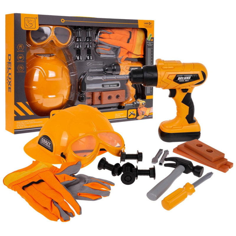 - šalmas maždaug 18 cm x 23, 5 cm x 8 cm, - pirštinės - apie 13 cm x 19 cm, - atsuktuvas apie 15, 8 cm x 2, 5 cm, - plaktukas apie 14, 8 cm x 8, 5 cm x 2, 5 cm, - maždaug 16 cm x 6, 5 cm x 4, 5 cm dydžio apsauginiai akiniai, - maždaug 13, 5 cm, 11, 2 cm ir 8, 8 cm mediena varžtams įsukti, - maždaug 3 cm skersmens perdanga, - maždaug 5 cm ilgio varžtas, - maždaug 16 cm x 18 cm x 5 cm dydžio grąžtas, - keičiami antgaliai: plokšti ir kryžminiai, maždaug 6, 5 cm ilgio, - apie 48 cm x 7, 3 cm x 33 cm dydžio pakuotė. |