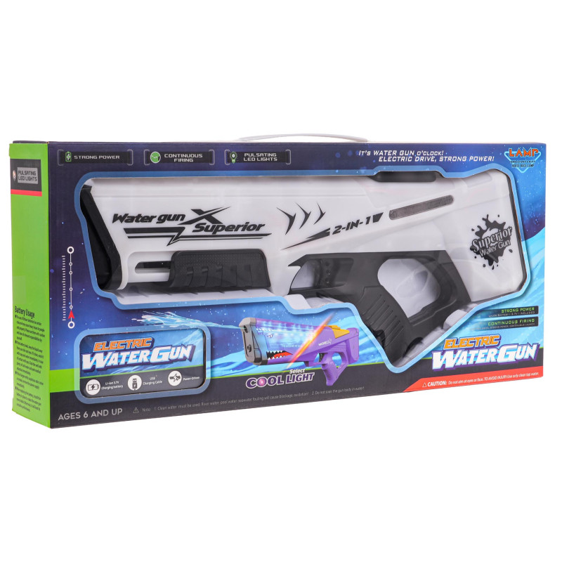 Elektrinis vandens pistoletas su apšvietimu, skirtas vaikams nuo 6 metų. Pistoletas pagamintas iš geriausios kokybės medžiagų, maitinamas 3, 7 V akumuliatoriumi (įeina į komplektą). Jis turi foninį apšvietimą, todėl galima žaisti net vėlai vakare. Pistoleto veikimo principas labai paprastas. Pripildome pistoleto viršuje esantį vandens rezervuarą. Tada atrakiname pistoletą (mygtukas šalia gaiduko) ir paspaudžiame gaiduką. Pistoletą taip pat galima naudoti be maitinimo, rankiniu būdu.