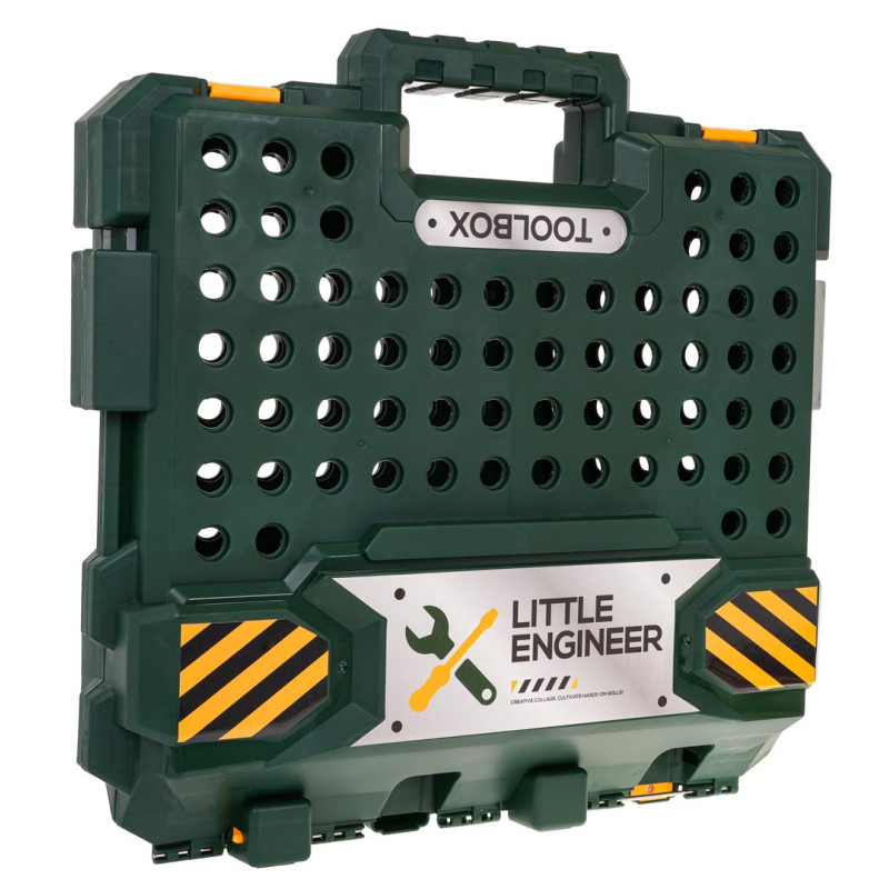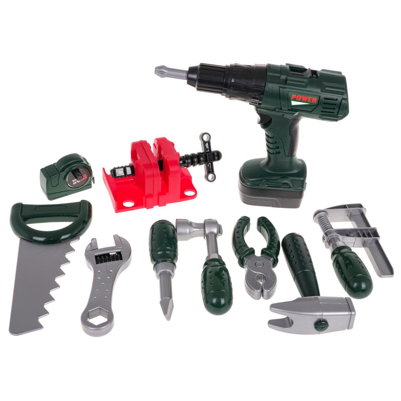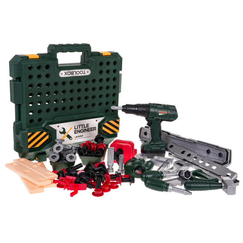 Gausiai aprūpintas 2-in-1 įrankių rinkinys su interaktyviu suktuvu-gręžtuvu, skirtas vaikams nuo 3 metų amžiaus. Rinkinys pagamintas iš aukščiausios kokybės plastiko ir susideda iš 98 elementų. Iš konstrukcinių rinkinio dalių galime sukomplektuoti darbastalį arba įrankių lagaminą. Rinkinį sudaro baterijomis maitinamas suktuvas-gręžtuvas, kuris iš tiesų suka ir atsisuka varžtus, o veikimo metu skleidžia šiam įrenginiui būdingus garsus. Į komplektą įtraukti spaustuvai (vairai) ištiesiami rankiniu būdu. Rinkinį taip pat sudaro: rankinis pjūklas, plaktukas, replės, reguliuojamas veržliaraktis, spaustuvas (prispaudėjas), veržliaraktis, matavimo juosta, įsukimo elementai ir daugybė varžtų, dangtelių bei kaiščių. Suktuvas-gręžtuvas maitinamas 2 x AA 1,5 V baterijomis (nepridedamos).