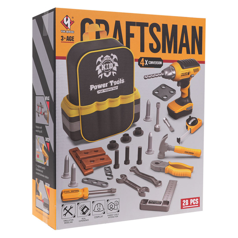 Gausiai aprūpintas įrankių rinkinys su įrankių kuprine ir interaktyviu gręžtuvu vaikams nuo 3 metų. Rinkinys pagamintas iš geriausios kokybės plastiko. Įrankių kuprinė turi pagrindinį skyrių su užtrauktuku, nedideles kišenėles šonuose ir įsiuvus, kuriuose tilps įrankiai. Grąžtas-suktuvas maitinamas 3 x AAA 1, 5 V akumuliatoriais (į komplektą neįeina) prisukamas ir atsukamas, papildomai turi keičiamą akumuliatorių kaip tikrame grąžte, keičiamus antgalius ir šviečia darbo metu. Rinkinyje yra net 28 elementai, be kuprinės ir gręžtuvo, taip pat yra: matuoklis, plaktukas, replės, veržliaraktis, kampuočiai, varžtai, kaiščiai, kaiščiai, elementai varžtams įsukti. Rinkinio ypatybės: - tinka vyresniems nei 3 metų vaikams, - pagamintas iš geriausios kokybės medžiagų, - profesionalus atlikimas ir dėmesys detalėms, - įrankių kuprinė turi pagrindinį skyrių su užtrauktuku, nedideles kišenes šonuose ir susiuvimo vietas, kuriose tilps įrankiai, - gręžtuvas yra su akumuliatoriumi, skleidžia garsus, įsuka ir atsuka varžtus, šviečia dirbant, įsuka ir atsuka varžtus, turi keičiamus antgalius ir keičiamą akumuliatorių, - turtinga iki 28 rinkinio elementų įranga. |