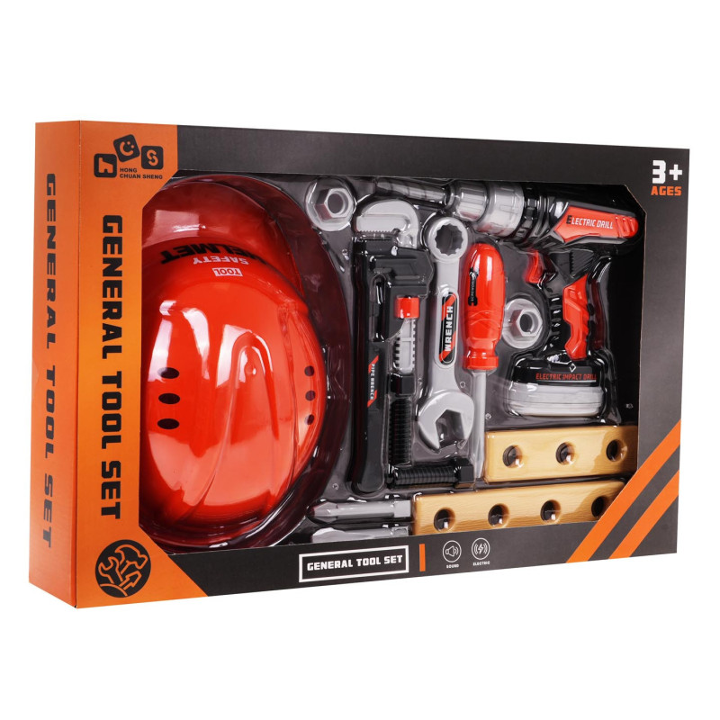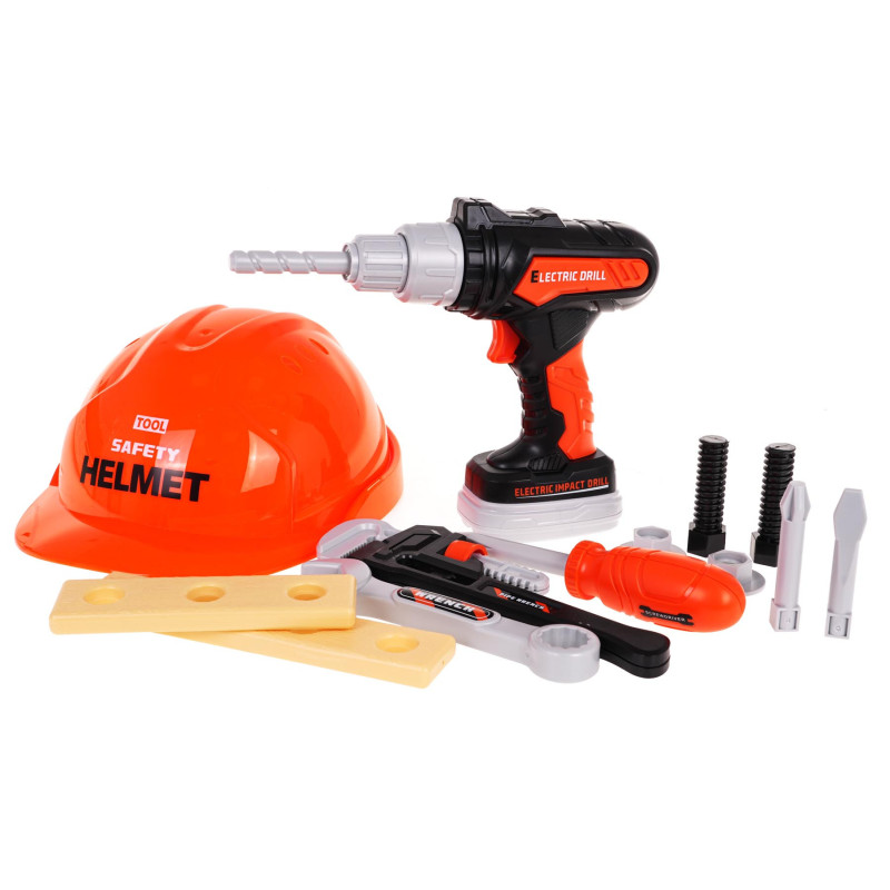 Gausiai aprūpintas įrankių rinkinys su šalmu ir interaktyviu suktuvu-gręžtuvu, skirtas vaikams nuo 3 metų amžiaus. Rinkinys pagamintas iš geriausios kokybės plastiko ir susideda iš 15 elementų. Be šalmo, rinkinį sudaro: grąžtas, atsuktuvas, reguliuojamas veržliaraktis, veržliaraktis, du varžtai, du varžtų dangteliai, maža ir didelė lentelė. Suktuvas-gręžtuvas maitinamas 2 x AA baterijomis, neįtrauktomis į komplektą, turi nuimamą bateriją, kaip ir tikras suaugusiųjų grąžtas, ir keičiamus antgalius: kryžminį, plokščią ir grąžto antgalį. Juo galime įsukti ir išsukti varžtus. Rinkinys lavina vaikų rankų įgūdžius, vaizduotę ir „Pasidaryk Pats“ (DIY) aistrą.
