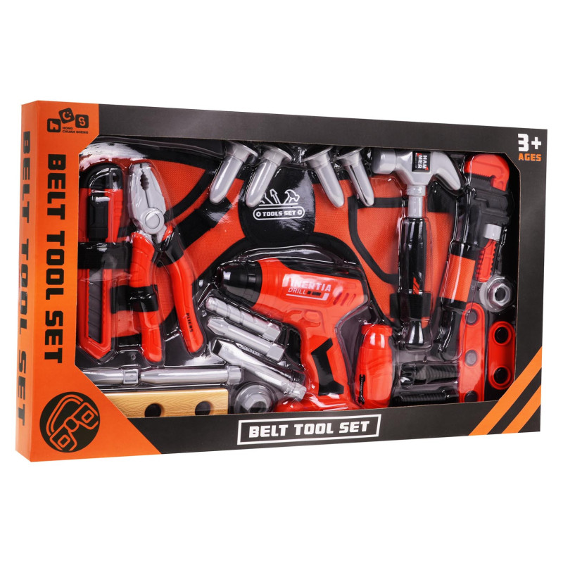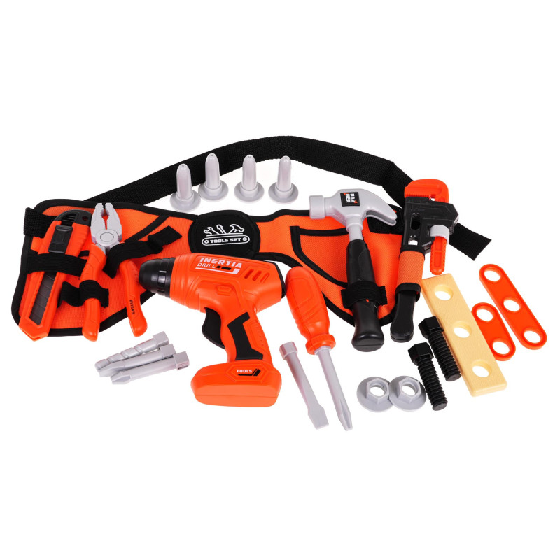 Gausiai aprūpintas įrankių rinkinys su diržu, skirtas vaikams nuo 3 metų amžiaus. Rinkinyje yra viskas, ko reikia mažajam meistrui, kad pjautų, gręžtų, suktų ir k altų. Be to, rinkinyje yra diržas, kad jūsų mažylis visada turėtų visus reikalingiausius įrankius su savimi. Grąžtas skleidžia garsus ir suka vieną iš 3 keičiamų antgalių. Veikimui nereikia baterijų – užtenka paspausti mygtuką.