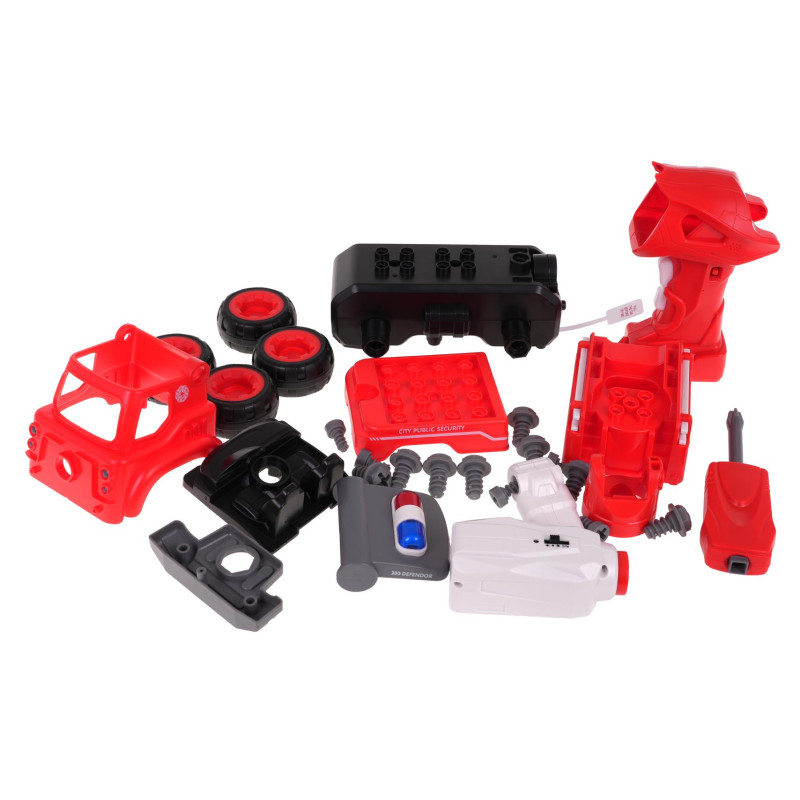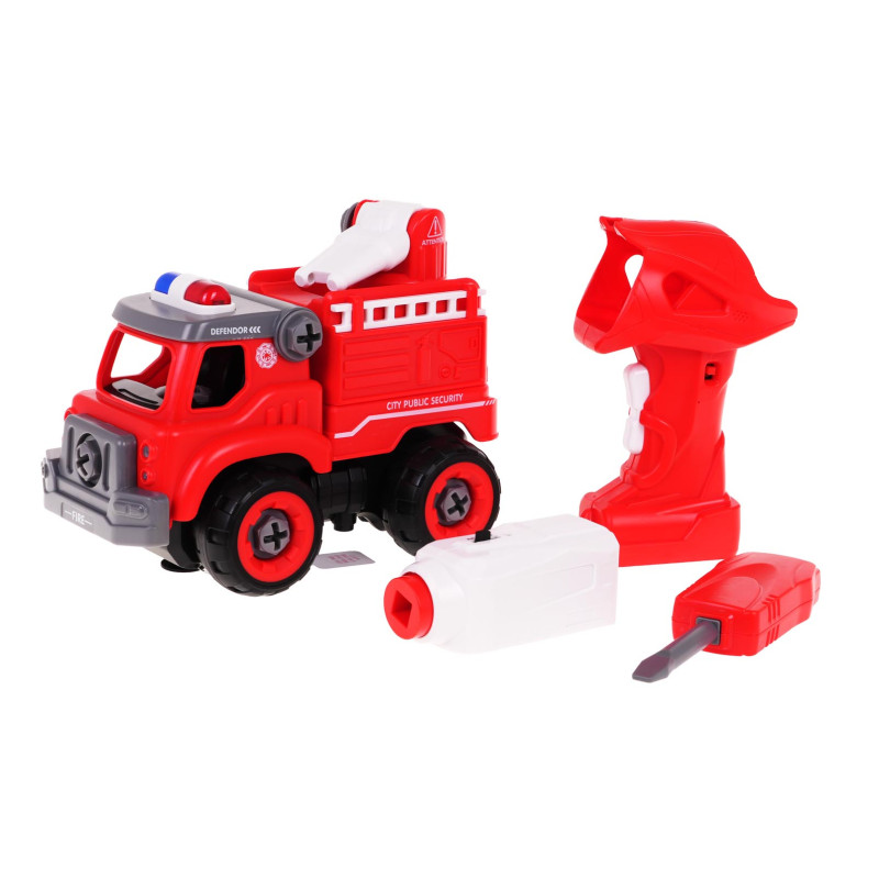 Interaktyvi ugniagesių departamento transporto priemonė, skirta pasukti vaikams nuo 3 metų, su komplekte esančiais priedais. Transporto priemonė pristatoma surinkta ir sukomplektuota, ją galima išardyti į pirmąsias dalis naudojant pridedamą atsuktuvą arba grąžtą. Atsuktuvas yra rankinis, o grąžtas - akumuliatorinis, maitinamas 2 x AA 1,5 V baterijomis (į komplektą neįeina). Gręžtuvas turi nuimamą skydelį, jei šį skydelį priartinsime prie automobilio, galėsime jį valdyti pirmyn ir atgal. Skydelyje taip pat yra galimybė nustatyti, kad transporto priemonė pati važiuotų pirmyn arba atgal. Ugniagesių automobilis taip pat turi garso efektus - gaisro signalus ir judančius elementus, pavyzdžiui, strėlę arba transporto priemonės stogą. Žaislas pagamintas iš geriausios kokybės medžiagų, ryškių spalvų. Valdymo pultas maitinamas 2 x AA 1,5 V baterijomis (į komplektą neįeina), automobilis - 3 x AG13 baterijomis (į komplektą įeina).