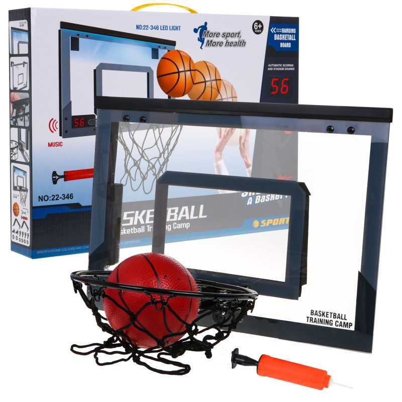 | Interaktyvi krepšinio lenta su automatiniu taškų skaičiavimu ir garsais - tai sportinis žaislas vaikams nuo šešerių metų. Žaislas turi garso efektų (stadiono garsai) ir šviesų (lentos viršaus apšvietimas, taškų skaičiavimas). Žaislas maitinamas 3 x AAA 1, 5 V baterijomis (į komplektą neįeina). Lentelę galima uždėti ant durų. | |