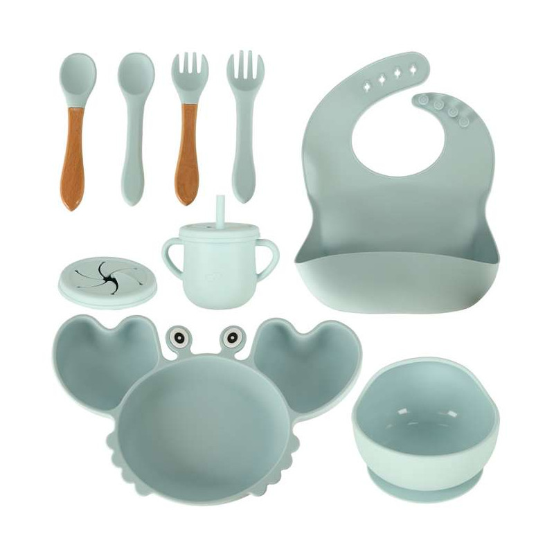 Rinkinį sudaro visi reikalingi priedai, pavyzdžiui, krabo formos lėkštė, dubenėlis su dangteliu, kad maistas neišbyrėtų ir neišsipiltų, puodelis su dviem dangteliais (įskaitant vieną su šiaudeliu), stalo įrankiai (kai kurie su medinėmis dalimis) ir šliaužtinukas. Su šiuo rinkiniu jūsų mažylis bus pasiruošęs bet kokiam maistui!