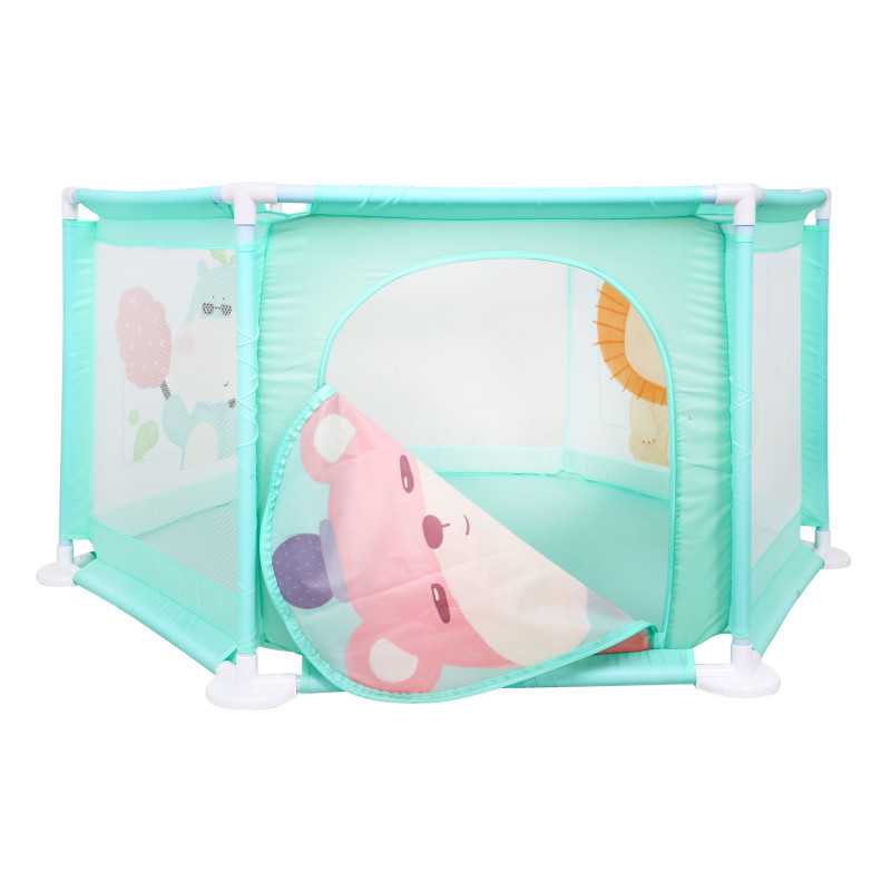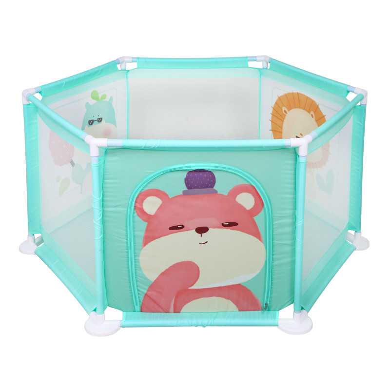 Trys aptvaro šonai pagaminti iš tinklelio, kuris leidžia stebėti žaidžiantį kūdikį. Kitose trijose pusėse yra gyvūnų (meškiuko, liūto, hipopotamo) raštai, kurie tikrai patiks jūsų vaikui. Lovytė turi įėjimą su užtrauktuku, kuris leidžia vaikui patogiai įeiti ir išeiti.